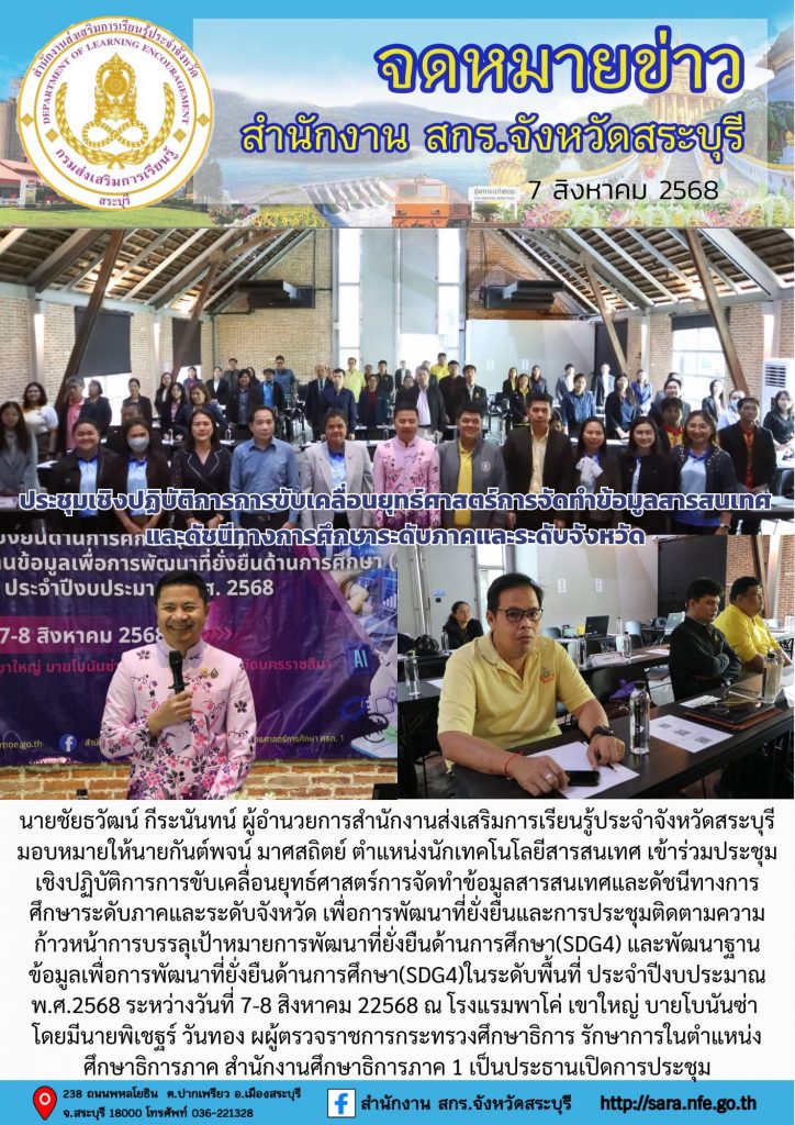 วันที่ 7 สิงหาคม 2569 นายชัยธวัฒน์ กีระนันทน์ ผู้อำนวยการสำนักงานส่งเสริมการเรียนรู้ประจำจังหวัดสระบุรี มอบหมายให้นายกันต์พจน์ มาศสถิตย์ ตำแหน่งนักเทคโนโลยีสารสนเทศ เข้าร่วมประชุมเชิงปฏิบัติการการขับเคลื่อนยุทธ์ศาสตร์การจัดทำข้อมูลสารสนเทศและดัชนีทางการศึกษาระดับภาคและระดับจังหวัด เพื่อการพัฒนาที่ยั่งยืนและการประชุมติดตามความก้าวหน้าการบรรลุเป้าหมายการพัฒนาที่ยั่งยืนด้านการศึกษา(SDG4) และพัฒนาฐานข้อมูลเพื่อการพัฒนาที่ยั่งยืนด้านการศึกษา(SDG4)ในระดับพื้นที่ ประจำปีงบประมาณ พ.ศ.2568 ระหว่างวันที่ 7-8 สิงหาคม 2568 ณ โรงแรมพาโค่ เขาใหญ่ บายโบนันซ่า โดยมีนายพิเชฐร์ วันทอง ผู้ตรวจราชการกระทรวงศึกษาธิการ รักษาการในตำแหน่งศึกษาธิการภาค สำนักงานศึกษาธิการภาค 1 เป็นประธานเปิดการประชุม