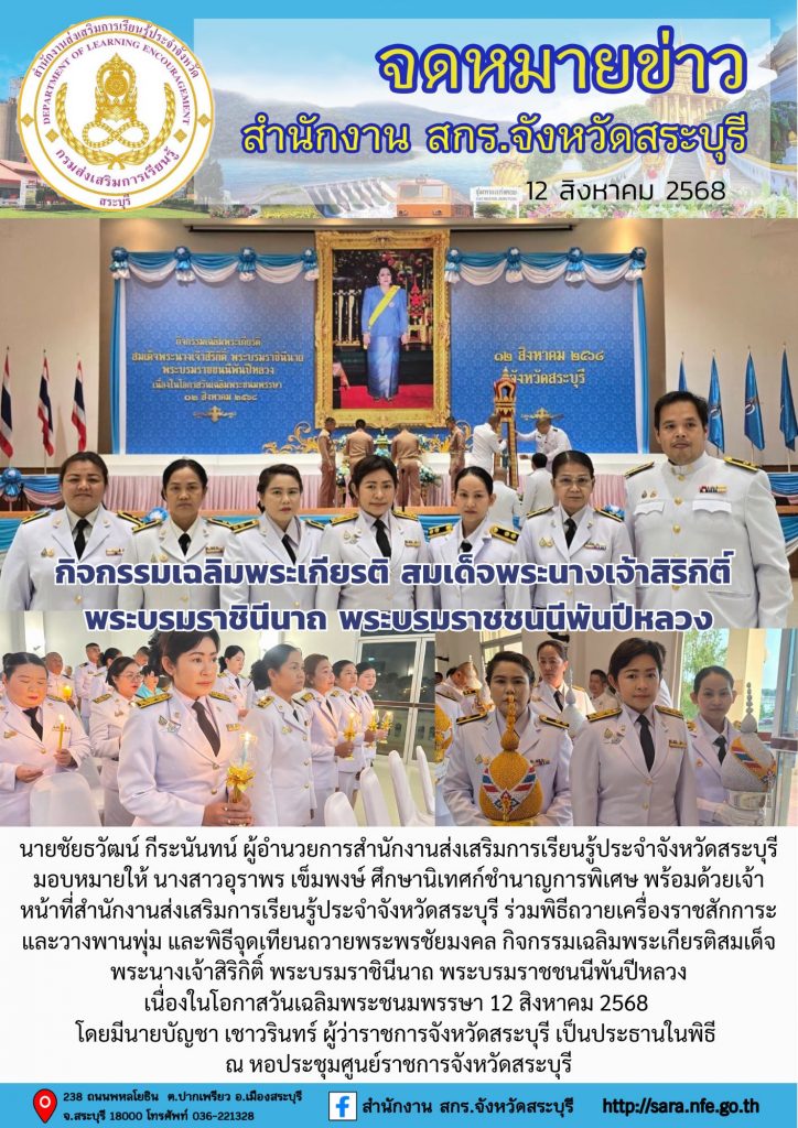วันที่ 12 สิงหาคม 2568 นายชัยธวัฒน์ กีระนันทน์ ผู้อำนวยการสำนักงานส่งเสริมการเรียนรู้ประจำจังหวัดสระบุรี มอบหมายให้ นางสาวอุราพร เข็มพงษ์ ศึกษานิเทศก์ชำนาญการพิเศษ พร้อมด้วยเจ้าหน้าที่สำนักงานส่งเสริมการเรียนรู้ประจำจังหวัดสระบุรี ร่วมพิธีถวายเครื่องราชสักการะและวางพานพุ่ม และพิธีจุดเทียนถวายพระพรชัยมงคล กิจกรรมเฉลิมพระเกียรติสมเด็จพระนางเจ้าสิริกิติ์ พระบรมราชินีนาถ พระบรมราชชนนีพันปีหลวง เนื่องในโอกาสวันเฉลิมพระชนมพรรษา 12 สิงหาคม 2568 โดยมีนายบัญชา เชาวรินทร์ ผู้ว่าราชการจังหวัดสระบุรี เป็นประธานในพิธี ณ หอประชุมศูนย์ราชการจังหวัดสระบุรี