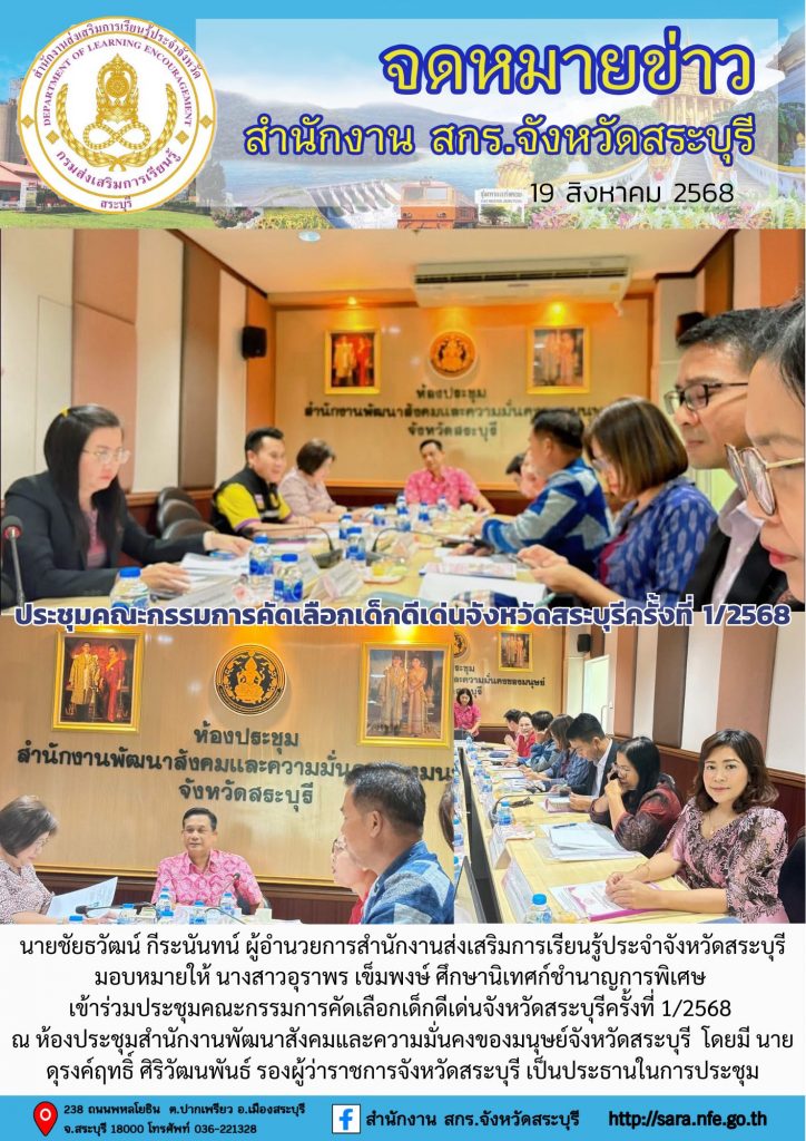 วันอังคารที่ 19 สิงหาคม 2568 นายชัยธวัฒน์ กีระนันทน์ ผู้อำนวยการสำนักงานส่งเสริมการเรียนรู้ประจำจังหวัดสระบุรี มอบหมายให้ นางสาวอุราพร เข็มพงษ์ ศึกษานิเทศก์ชำนาญการพิเศษ เข้าร่วม ประชุมคณะกรรมการคัดเลือกเด็กดีเด่นจังหวัดสระบุรีครั้งที่ 1/2568 ณ ห้องประชุมสำนักงานพัฒนาสังคมและความมั่นคงของมนุษย์จังหวัดสระบุรี (ชั้น1) ศาลากลางจังหวัดสระบุรี โดยมี นายดุรงค์ฤทธิ์ ศิริวัฒนพันธ์ รองผู้ว่าราชการจังหวัดสระบุรี เป็นประธานในการประชุม ดังกล่าว