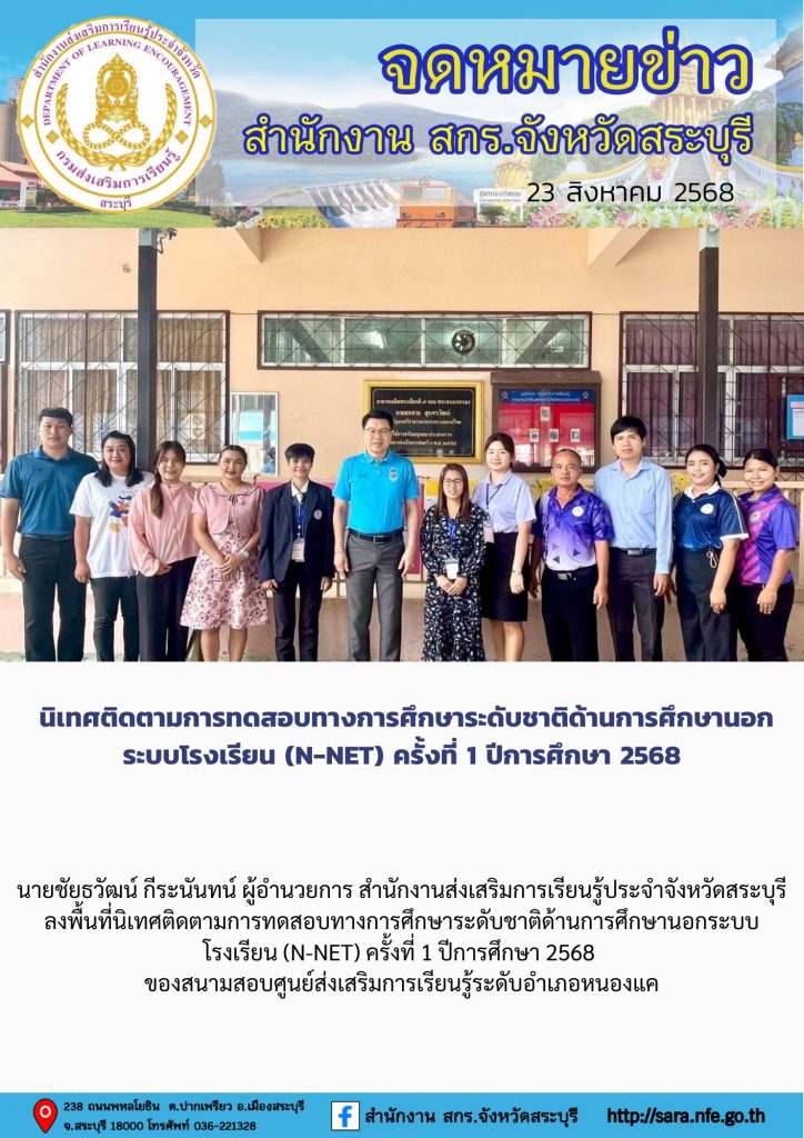 วันที่ 23 สิงหาคม 2568 นายชัยธวัฒน์ กีระนันทน์ ผู้อำนวยการ สำนักงานส่งเสริมการเรียนรู้ประจำจังหวัดสระบุรี ลงพื้นที่นิเทศติดตามการทดสอบทางการศึกษาระดับชาติด้านการศึกษานอกระบบโรงเรียน (N-NET) ครั้งที่ 1 ปีการศึกษา 2568 ของสนามสอบศูนย์ส่งเสริมการเรียนรู้ระดับอำเภอหนองแค