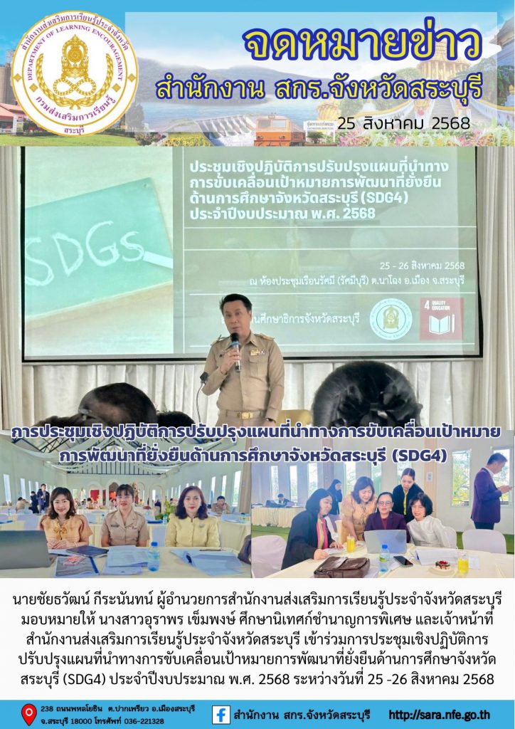 วันที่ 25 สิงหาคม 2568 นายชัยธวัฒน์ กีระนันทน์ ผู้อำนวยการสำนักงานส่งเสริมการเรียนรู้ประจำจังหวัดสระบุรี มอบหมายให้ นางสาวอุราพร เข็มพงษ์ ศึกษานิเทศก์ชำนาญการพิเศษ และเจ้าหน้าที่ สำนักงานส่งเสริมการเรียนรู้ประจำจังหวัดสระบุรี เข้าร่วมการประชุมเชิงปฏิบัติการปรับปรุงแผนที่นำทางการขับเคลื่อนเป้าหมายการพัฒนาที่ยั่งยืนด้านการศึกษาจังหวัดสระบุรี (SDG4) ประจำปีงบประมาณ พ.ศ. 2568 ระหว่างวันที่ 25 -26 สิงหาคม 2568