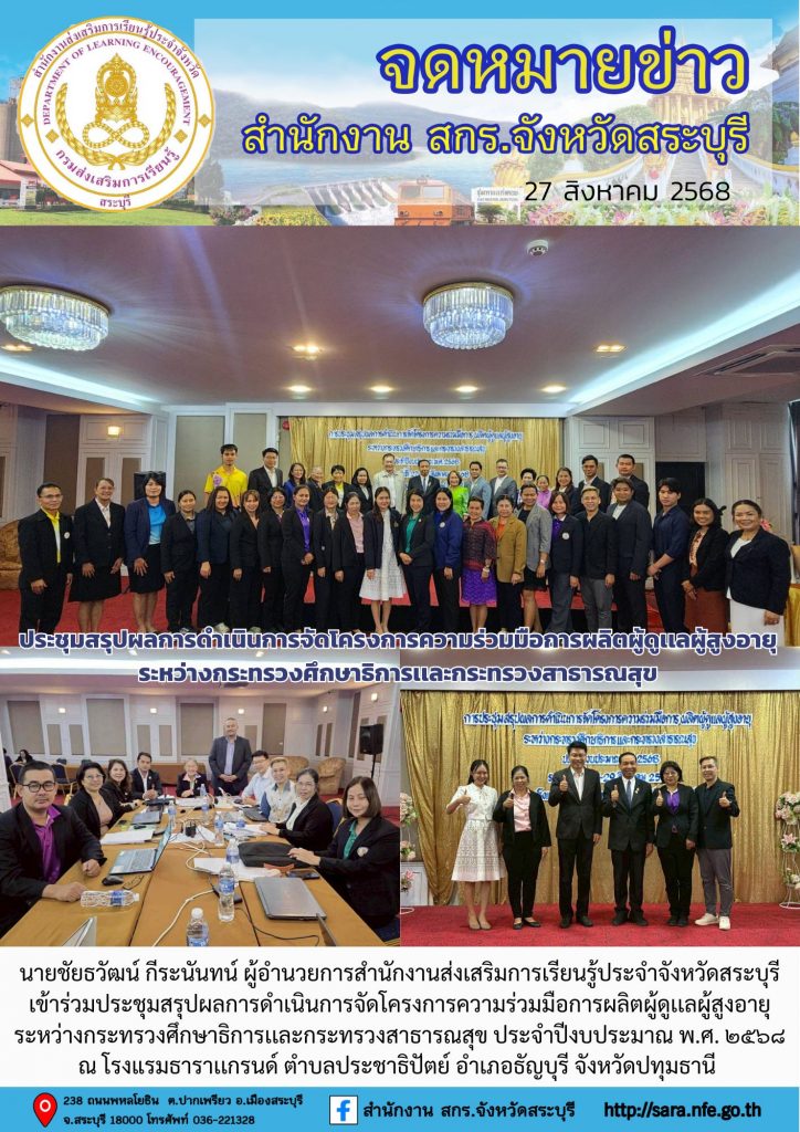 วันที่ ๒๗ สิงหาคม ๒๕๖๘ นายชัยธวัฒน์ กีระนันทน์ ผู้อำนวยการสำนักงานส่งเสริมการเรียนรู้ประจำจังหวัดสระบุรี เข้าร่วมประชุมสรุปผลการดำเนินการจัดโครงการความร่วมมือการผลิตผู้ดูเเลผู้สูงอายุ ระหว่างกระทรวงศึกษาธิการเเละกระทรวงสาธารณสุข ประจำปีงบประมาณ พ.ศ. ๒๕๖๘ ณ โรงแรมธาราเเกรนด์ ตำบลประชาธิปัตย์ อำเภอธัญบุรี จังหวัดปทุมธานี ระหว่างวันที่ ๒๗ – ๒๙ สิงหาคม ๒๕๖๘ เพื่อสรุปผลการดำเนินการจัดโครงการฯ