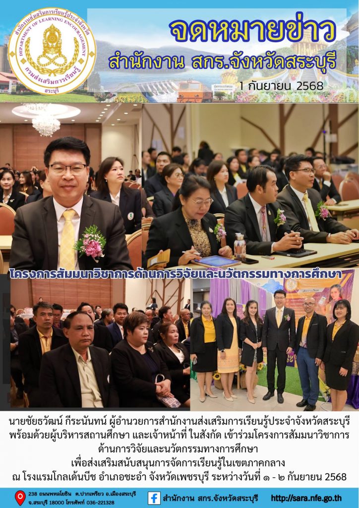 วันที่ ๑ กันยายน ๒๕๖๘ นายชัยธวัฒน์ กีระนันทน์ ผู้อำนวยการสำนักงานส่งเสริมการเรียนรู้ประจำจังหวัดสระบุรี พร้อมด้วยผู้บริหารสถานศึกษา และเจ้าหน้าที่ ในสังกัด เข้าร่วมโครงการสัมมนาวิชาการด้านการวิจัยและนวัตกรรมทางการศึกษา เพื่อส่งเสริมสนับสนุนการจัดการเรียนรู้ในเขตภาคกลาง ณ โรงแรมโกลเด้นบีช อำเภอชะอำ จังหวัดเพชรบุรี ระหว่างวันที่ ๑ – ๒ กันยายน ๒๕๖๘ เพื่อส่งเสริมผลงานทางวิชาการของบุคลากร นวัตกรรมทางการศึกษาเเละผลการปฏิบัติที่เป็นเลิศ