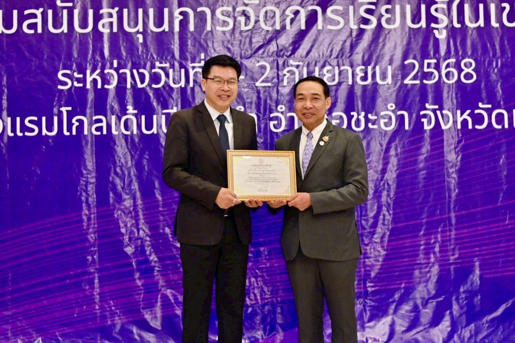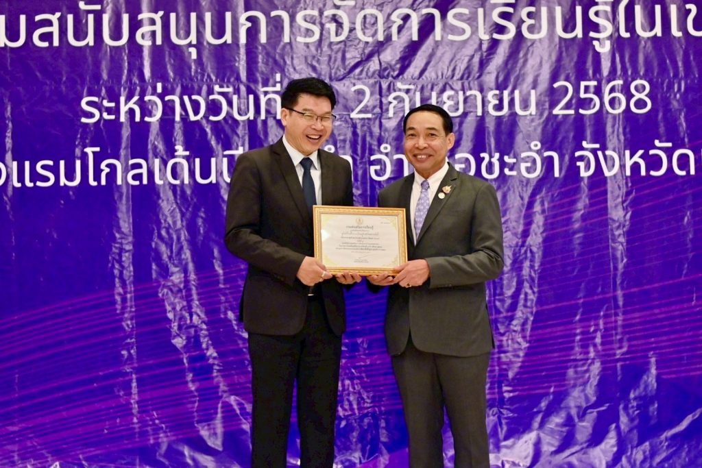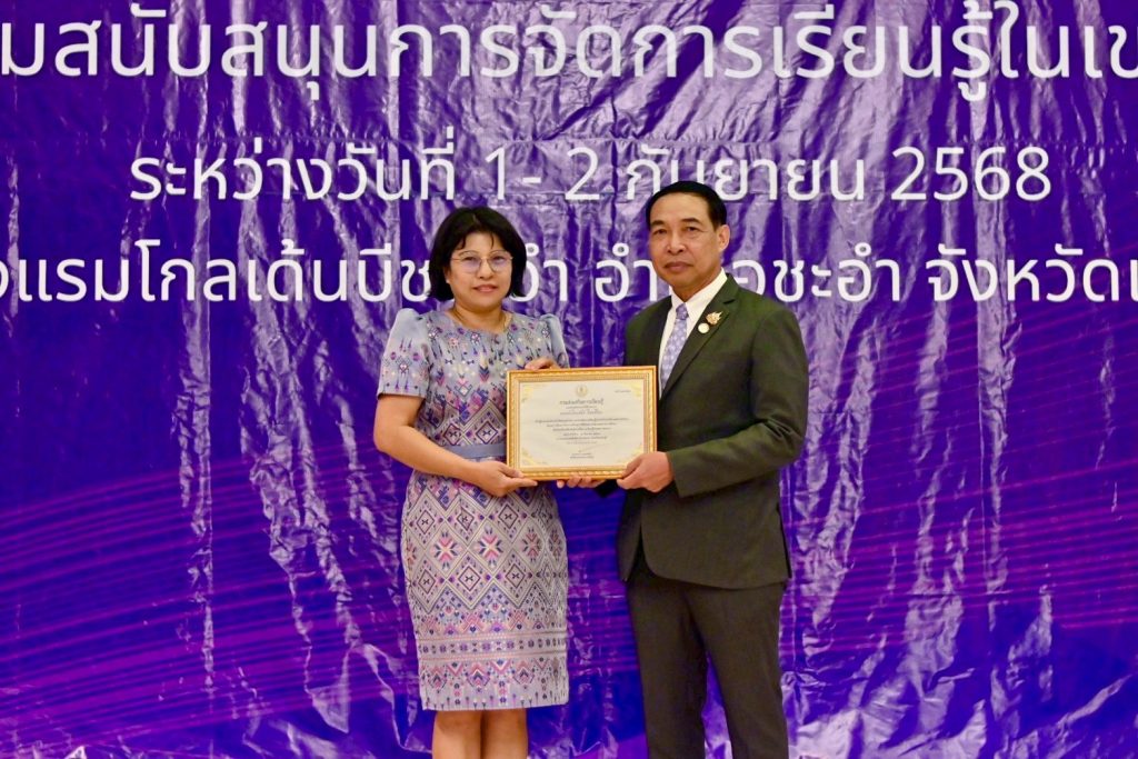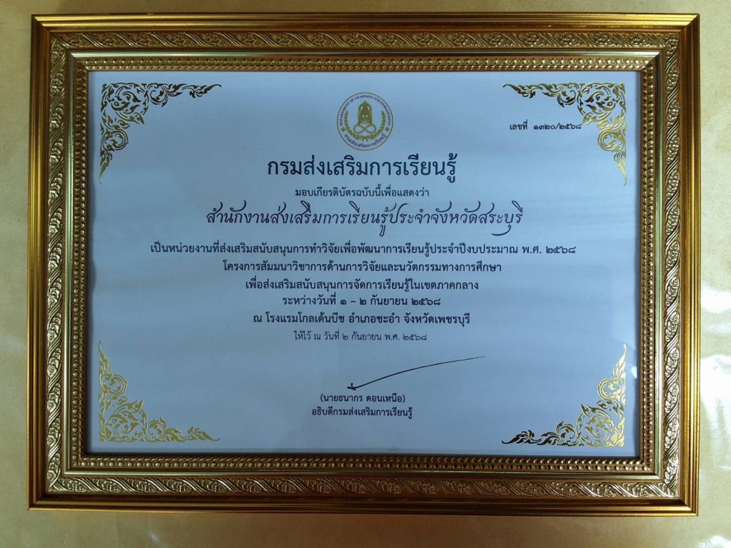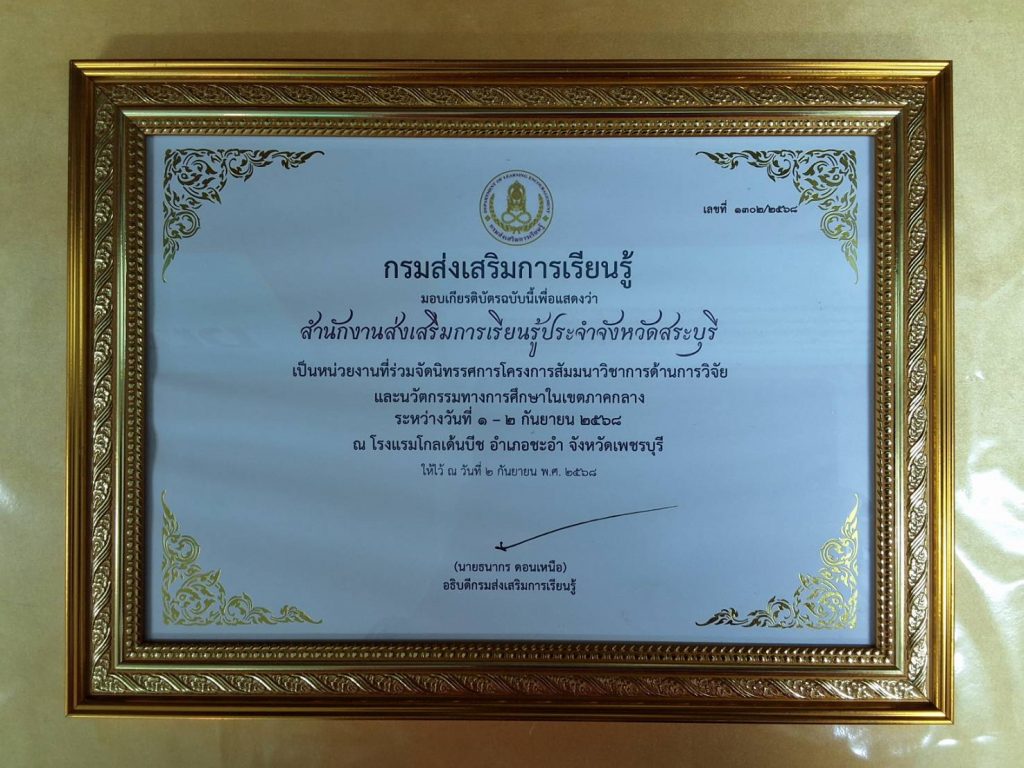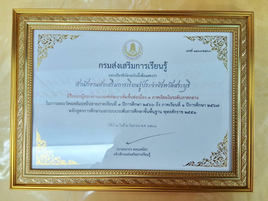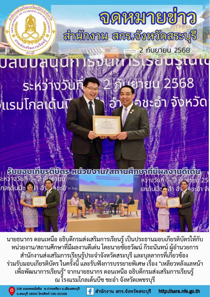 วันที่ 2 กันยายน 2568 นายธนากร ดอนเหนือ อธิบดีกรมส่งเสริมการเรียนรู้ เป็นประธานมอบเกียรติบัตรให้กับหน่วยงาน/สถานศึกษาที่มีผลงานดีเด่น โดยนายชัยธวัฒน์ กีระนันทน์ ผู้อำนวยการ สำนักงานส่งเสริมการเรียนรู้ประจำจังหวัดสระบุรี และบุลลากรที่เกี่ยวข้อง ร่วมรับมอบเกียรติบัตร ในครั้งนี้ และรับฟังการบรรยายพิเศษ เรื่อง “เหลียวหลังแลหน้า เพื่อพัฒนาการเรียนรู้” จากนายธนากร ดอนเหนือ อธิบดีกรมส่งเสริมการเรียนรู้ ณ โรงแรมโกลเด้นบีช ชะอำ จังหวัดเพชรบุรี