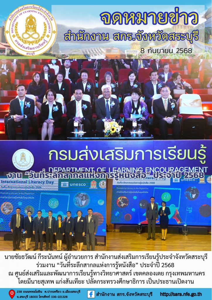 วันที่ 8 กันยายน 2568 นายชัยธวัฒน์ กีระนันทน์ ผู้อำนวยการ สำนักงานส่งเสริมการเรียนรู้ประจำจังหวัดสระบุรี ร่วมงาน “วันที่ระลึกสากลแห่งการรู้หนังสือ” ประจำปี 2568 พร้อมมอบโล่ประกาศเกียรติคุณให้แก่บุคลากรของกรมส่งเสริมการเรียนรู้ และในการนี้ได้เยี่ยมชมการจัดนิทรรศการของหน่วยงานในสังกัดกรมส่งเสริมการเรียนรู้ โดยมี นางริกะ โยโรสุ ผู้เชี่ยวชาญด้านการศึกษา สำนักงานยูเนสโกส่วนภูมิภาค ณ กรุงเทพฯ คณะผู้บริหารระดับสูงของกระทรวงศึกษาธิการนายธนากร ดอนเหนือ อธิบดีกรมส่งเสริมการเรียนรู้ นางยุพิน บัวคอม รองอธิบดีกรมส่งเสริมการเรียนรู้ นายเอกราช ชวีวัฒน์ รองอธิบดีกรมส่งเสริมการเรียนรู้ นายชัยพัฒน์ พันธุ์วัฒนสกุล รองอธิบดีกรมส่งเสริมการเรียนรู้ คณะผู้บริหารและบุคลากรในสังกัดกรมส่งเสริมการเรียนรู้เข้าร่วม ณ ศูนย์ส่งเสริมและพัฒนาการเรียนรู้ทางวิทยาศาสตร์ เขตคลองเตย กรุงเทพมหานคร โดยมีนายสุเทพ แก่งสันเทียะ ปลัดกระทรวงศึกษาธิการ เป็นประธานเปิดงาน