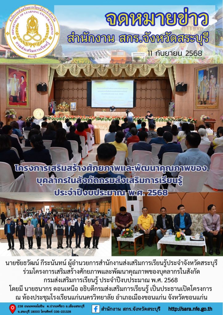 วันที่ 11 กันยายน 2568 นายชัยธวัฒน์ กีระนันทน์ ผู้อำนวยการสำนักงานส่งเสริมการเรียนรู้ประจำจังหวัดสระบุรี ร่วมโครงการเสริมสร้างศักยภาพและพัฒนาคุณภาพของบุคลากรในสังกัดกรมส่งเสริมการเรียนรู้ ประจำปีงบประมาณ พ.ศ. 2568 โดยมี นายธนากร ดอนเหนือ อธิบดีกรมส่งเสริมการเรียนรู้ เป็นประธานเปิดโครงการ ณ ห้องประชุมโรงเรียนแก่นนครวิทยาลัย อำเภอเมืองขอนแก่น จังหวัดขอนแก่น