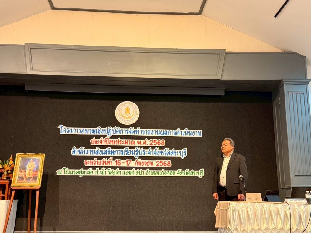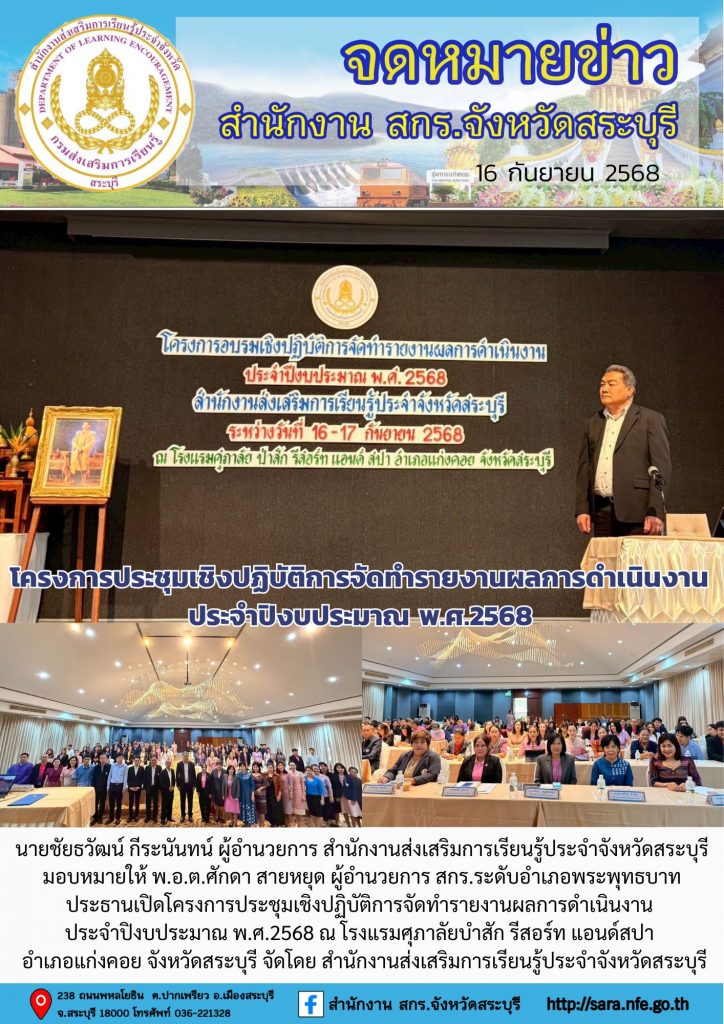 วันที่ 16 กันยายน 2568 นายชัยธวัฒน์ กีระนันทน์ ผู้อำนวยการ สำนักงานส่งเสริมการเรียนรู้ประจำจังหวัดสระบุรี มอบหมายให้ พ.อ.ต.ศักดา สายหยุด ผู้อำนวยการ สกร.ระดับอำเภอพระพุทธบาท ประธานเปิดโครงการประชุมเชิงปฏิบัติการจัดทำรายงานผลการดำเนินงาน ประจำปิงบประมาณ พ.ศ.2568 ณ โรงแรมศุภาลัยบำสัก รีสอร์ท แอนด์สปา ตำบลท่าคล้อ อำเภอแก่งคอย จังหวัดสระบุรี จัดโดย สำนักงานส่งเสริมการเรียนรู้ประจำจังหวัดสระบุรี