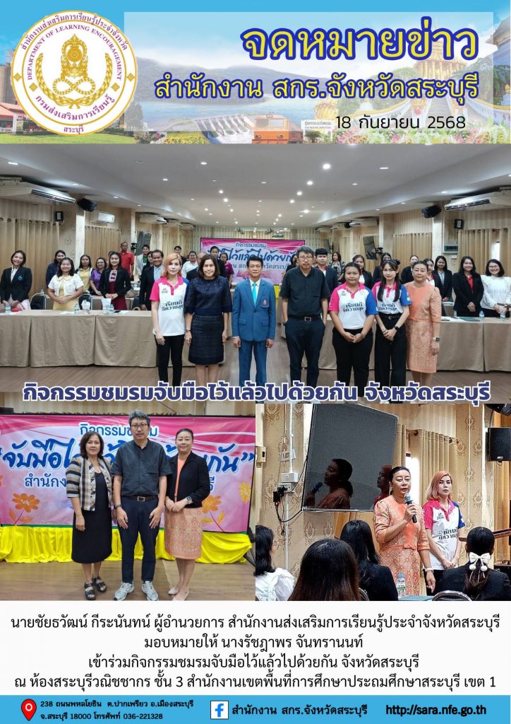 วันที่ 18 กันยายน 2568 นายชัยธวัฒน์ กีระนันทน์ ผู้อำนวยการ สำนักงานส่งเสริมการเรียนรู้ประจำจังหวัดสระบุรี มอบหมายให้ นางรัชฎาพร จันทรานนท์ เข้าร่วมกิจกรรมชมรมจับมือไว้แล้วไปด้วยกัน จังหวัดสระบุรี ณ ห้องสระบุรีวณิชชากร ชั้น 3 สำนักงานเขตพื้นที่การศึกษาประถมศึกษาสระบุรี เขต 1