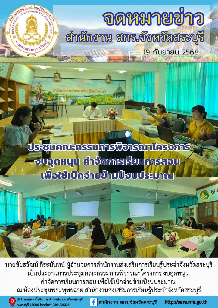 วันที่ 19 กันยายน 2568 นายชัยธวัฒน์ กีระนันทน์ ผู้อำนวยการสำนักงานส่งเสริมการเรียนรู้ประจำจังหวัดสระบุรี เป็นประธานการประชุมคณะกรรมการพิจารณาโครงการ งบอุดหนุน ค่าจัดการเรียนการสอน เพื่อใช้เบิกจ่ายข้ามปีงบประมาณ ณ ห้องประชุมพระพุทธฉาย สำนักงานส่งเสริมการเรียนรู้ประจำจังหวัดสระบุรี