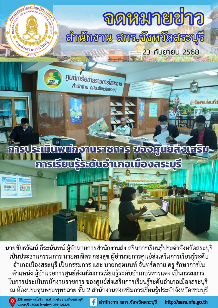 วันที่ 23 กันยายน 2568 นายชัยธวัฒน์ กีระนันทน์ ผู้อำนวยการสำนักงานส่งเสริมการเรียนรู้ประจำจังหวัดสระบุรี เป็นประธานกรรมการ นายสมจิตร กองสุข ผู้อำนวยการศูนย์ส่งเสริมการเรียนรู้ระดับอำเภอเมืองสระบุรี เป็นกรรมการ และ นายกฤตนนท์ จันทร์คลาย ครู รักษาการในตำแหน่ง ผู้อำนวยการศูนย์ส่งเสริมการเรียนรู้ระดับอำเภอวิหารแดง เป็นกรรมการ ในการประเมินพนักงานราชการ ของศูนย์ส่งเสริมการเรียนรู้ระดับอำเภอเมืองสระบุรี ณ ห้องประชุมพระพุทธฉาย ชั้น 2 สำนักงานส่งเสริมการเรียนรู้ประจำจังหวัดสระบุรี