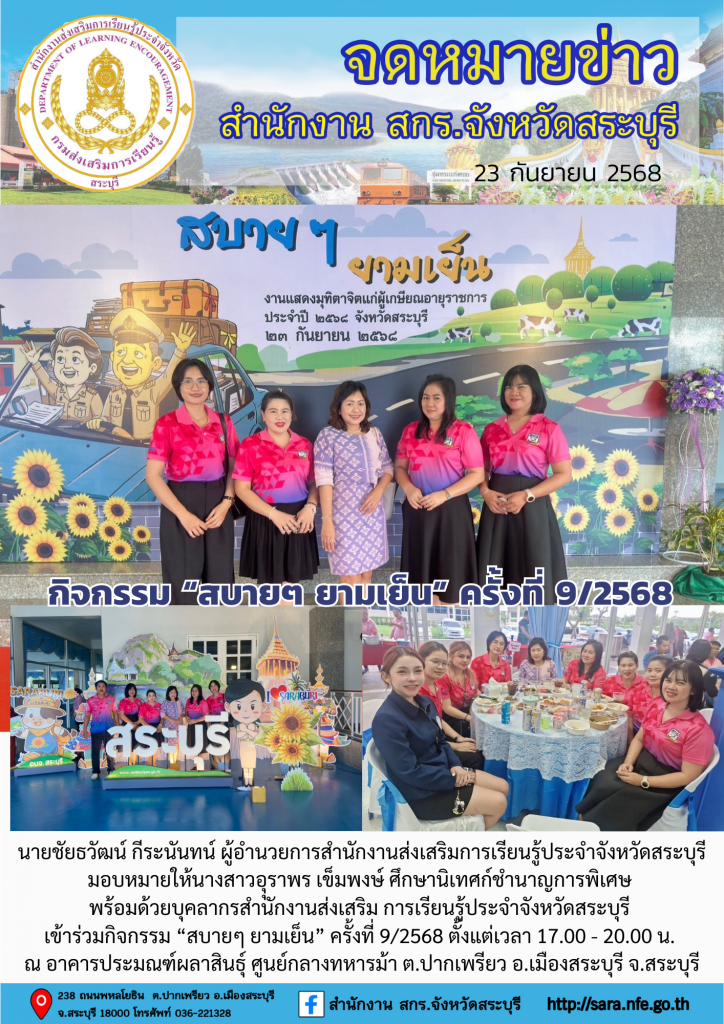 วันอังคารที่ 23 กันยายน 2568 นายชัยธวัฒน์ กีระนันทน์ ผู้อำนวยการสำนักงานส่งเสริมการเรียนรู้ประจำจังหวัดสระบุรี มอบหมายให้นางสาวอุุราพร เข็มพงษ์ ศึกษานิเทศก์ชำนาญการพิเศษ พร้อมด้วยบุคลากรสำนักงานส่งเสริม การเรียนรู้ประจำจังหวัดสระบุรี เข้าร่วมกิจกรรม “สบายๆ ยามเย็น” ครั้งที่ 9/2568 ตั้งแต่เวลา 17.00 – 20.00 น. ณ อาคารประมณฑ์ผลาสินธุ์ ศูนย์กลางทหารม้า ต.ปากเพรียว อ.เมืองสระบุรี จ.สระบุรี