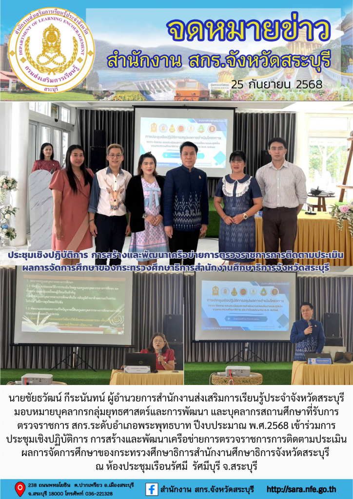 วันที่ 25 กันยายน 2568 นายชัยธวัฒน์ กีระนันทน์ ผู้อำนวยการสำนักงานส่งเสริมการเรียนรู้ประจำจังหวัดสระบุรี มอบหมายบุคลากรกลุ่มยุทธศาสตร์และการพัฒนา และบุคลากรสถานศึกษาที่รับการตรวจราชการ สกร.ระดับอำเภอพระพุทธบาท ปีงบประมาณ พ.ศ.2568 เข้าร่วมการประชุมเชิงปฏิบัติการ การสร้างและพัฒนาเครือข่ายการตรวจราชการ