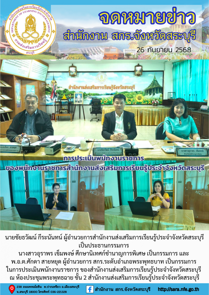วันที่ 26 กันยายน 2568 นายชัยธวัฒน์ กีระนันทน์ ผู้อำนวยการสำนักงานส่งเสริมการเรียนรู้ประจำจังหวัดสระบุรี เป็นประธานกรรมการ นางสาวอุราพร เข็มพงษ์ ศึกษานิเทศก์ชำนาญการพิเศษ เป็นกรรมการ และ พ.อ.ต.ศักดา สายหยุด ผู้อำนวยการ สกร.ระดับอำเภอพระพุทธบาท เป็นกรรมการ ในการประเมินพนักงานราชการ ของสำนักงานส่งเสริมการเรียนรู้ประจำจังหวัดสระบุรี ณ ห้องประชุมพระพุทธฉาย ชั้น 2 สำนักงานส่งเสริมการเรียนรู้ประจำจังหวัดสระบุรี