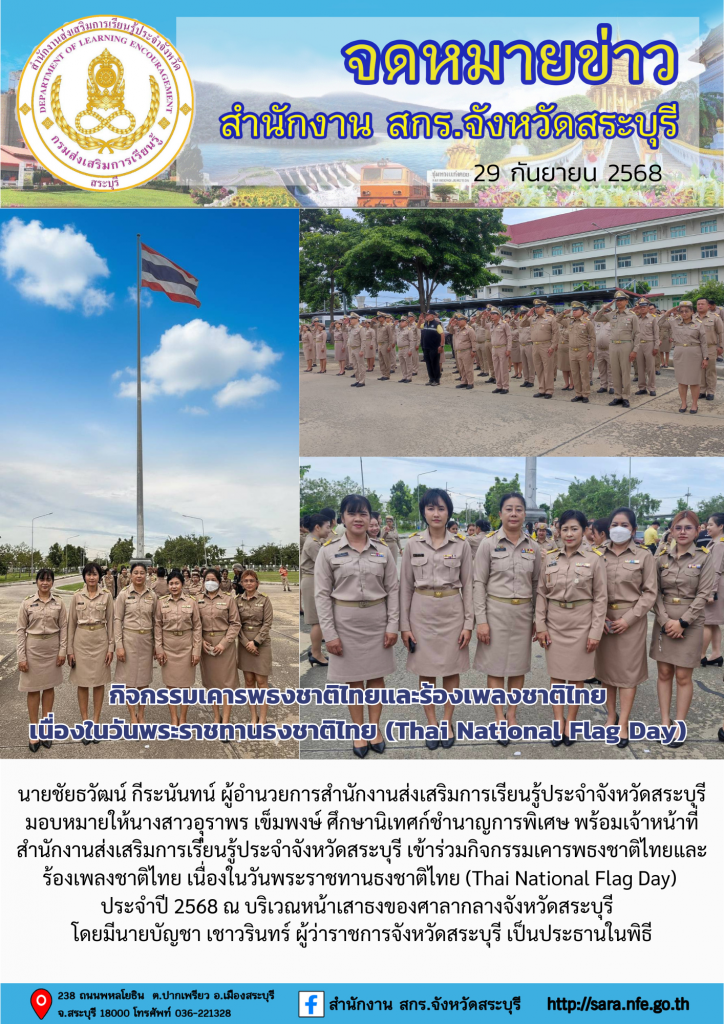 วันจันทร์ที่ 29 กันยายน 2568 : “นายชัยธวัฒน์ กีระนันทน์ ผู้อำนวยการสำนักงานส่งเสริมการเรียนรู้ประจำจังหวัดสระบุรี มอบหมายให้นางสาวอุุราพร เข็มพงษ์ ศึกษานิเทศก์ชำนาญการพิเศษ พร้อมเจ้าหน้าที่สำนักงานส่งเสริมการเรียนรู้ประจำจังหวัดสระบุรี เข้าร่วมกิจกรรมเคารพธงชาติไทยและร้องเพลงชาติไทย เนื่องในวันพระราชทานธงชาติไทย (Thai National Flag Day) ประจำปี 2568 ณ บริเวณหน้าเสาธงของศาลากลางจังหวัดสระบุรี ตำบลตะกุด อำเภอเมืองสระบุรี จังหวัดสระบุรี โดยมีนายบัญชา เชาวรินทร์ ผู้ว่าราชการจังหวัดสระบุรี เป็นประธานในพิธี
