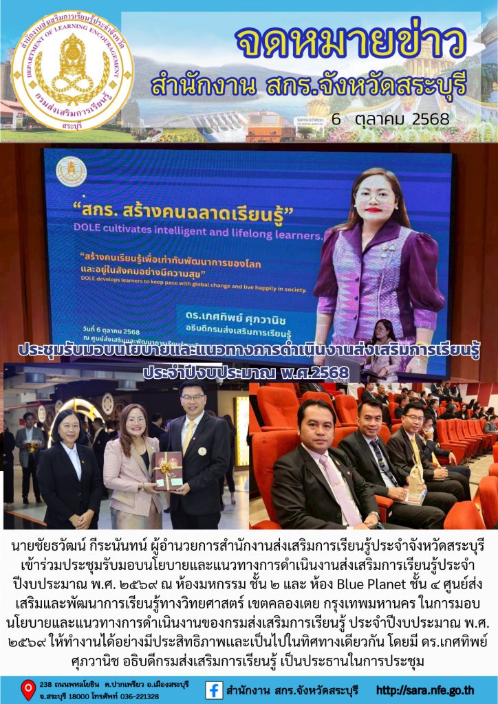 วันที่ 6 ตุลาคม 2568 นายชัยธวัฒน์ กีระนันทน์ ผู้อำนวยการสำนักงานส่งเสริมการเรียนรู้ประจำจังหวัดสระบุรี เข้าร่วมประชุมรับมอบนโยบายและแนวทางการดำเนินงานส่งเสริมการเรียนรู้ประจำปีงบประมาณ พ.ศ. ๒๕๖๙ ณ ห้องมหกรรม ชั้น ๒ และ ห้อง Blue Planet ชั้น ๔ ศูนย์ส่งเสริมและพัฒนาการเรียนรู้ทางวิทยศาสตร์ เขตคลองเตย กรุงเทพมหานคร ในการมอบนโยบายและแนวทางการดำเนินงานของกรมส่งเสริมการเรียนรู้ ประจำปีงบประมาณ พ.ศ. ๒๕๖๙ ให้ทำงานได้อย่างมีประสิทธิภาพเเละเป็นไปในทิศทางเดียวกัน โดยมีดร.เกศทิพย์ ศุภวานิช อธิบดีกรมส่งเสริมการเรียนรู้ เป็นประธานในการประชุม