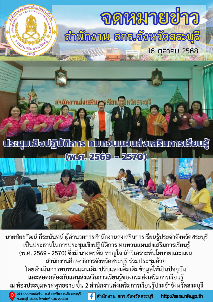 วันที่ 16 ตุลาคม 2568 นายชัยธวัฒน์ กีระนันทน์ ผู้อำนวยการสำนักงานส่งเสริมการเรียนรู้ประจำจังหวัดสระบุรี เป็นประธานในการประชุมเชิงปฏิบัติการ ทบทวนแผนส่งเสริมการเรียนรู้(พ.ศ. 2569 – 2570) ซึ่งมี นางพรพิล หาญใจ นักวิเคราะห์นโยบายและแผน สำนักงานศึกษาธิการจังหวัดสระบุรี ร่วมประชุมด้วย โดยดำเนินการทบทวนแผนเดิม ปรับและเพิ่มเติมข้อมูลให้เป็นปัจจุบัน และสอดคล้องกับแผนส่งเสริมการเรียนรู้ของกรมส่งเสริมการเรียนรู้ ณ ห้องประชุมพระพุทธฉาย ชั้น 2 สำนักงานส่งเสริมการเรียนรู้ประจำจังหวัดสระบุรี