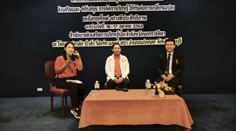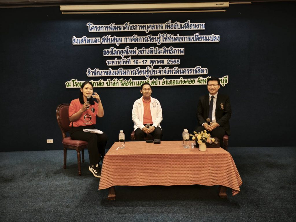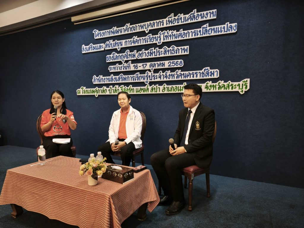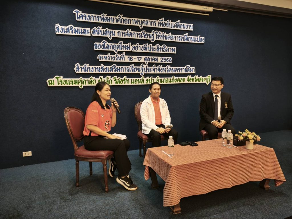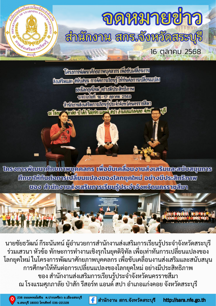 วันที่ 16 ตุลาคม 2568 นายชัยธวัฒน์ กีระนันทน์ ผู้อำนวยการสำนักงานส่งเสริมการเรียนรู้ประจำจังหวัดสระบุรี ร่วมเสวนา หัวข้อ ทักษะการทำงานเชิงรุกในยุคดิจิทัล เพื่อเท่าทันการเปลี่ยนแปลงของโลกยุคใหม่ ในโครงการพัฒนาศักยภาพบุคคลกร เพื่อขับเคลื่อนงานส่งเสริมและสนับสนุนการศึกษาให้ทันต่อการเปลี่ยนแปลงของโลกยุคใหม่ อย่างมีประสิทธิภาพ