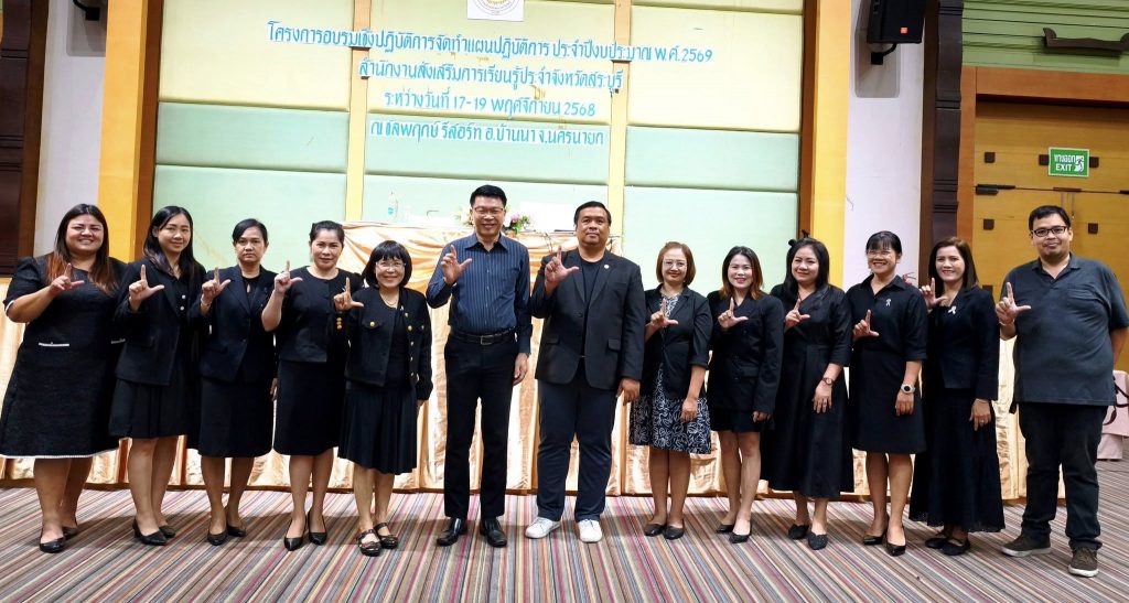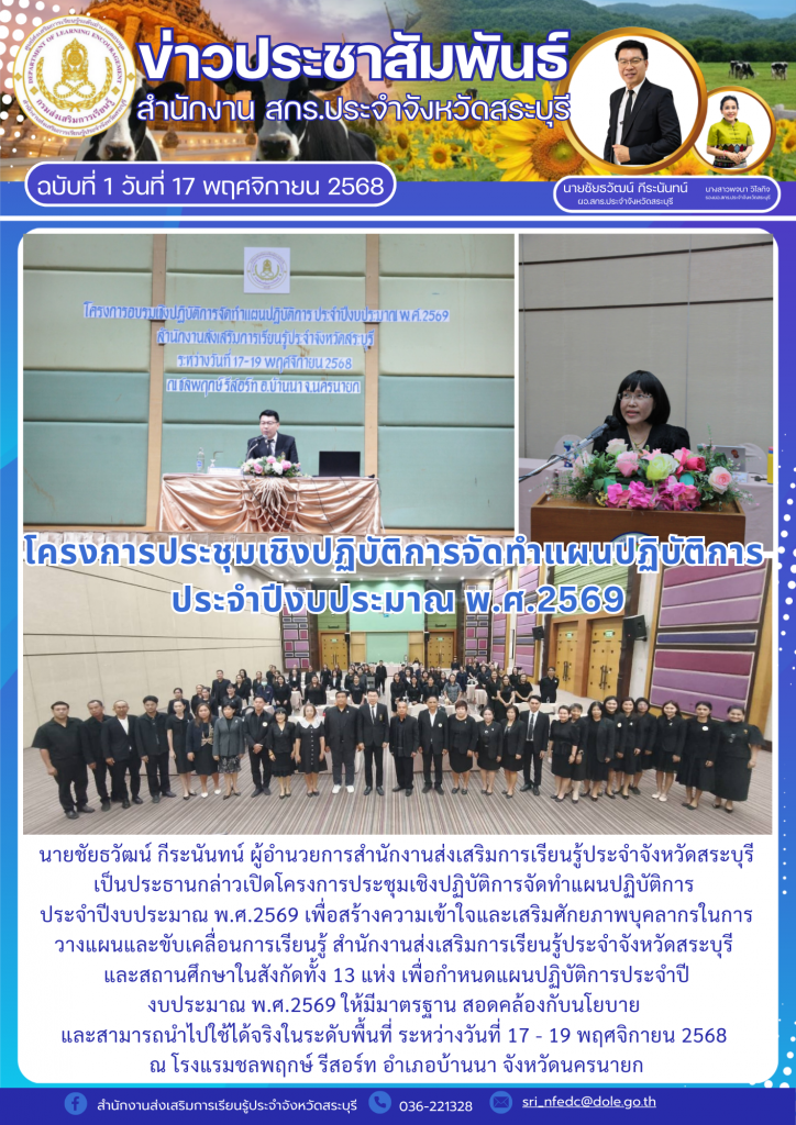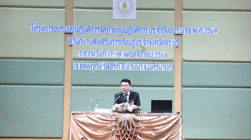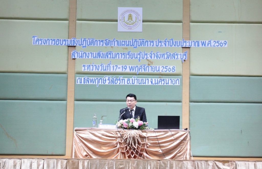 วันที่ 17 พฤศจิกายน 2568 นายชัยธวัฒน์ กีระนันทน์ ผู้อำนวยการสำนักงานส่งเสริมการเรียนรู้ประจำจังหวัดสระบุรี เป็นประธานกล่าวเปิดโครงการประชุมเชิงปฏิบัติการจัดทำแผนปฏิบัติการ ประจำปีงบประมาณ พ.ศ.2569 เพื่อสร้างความเข้าใจและเสริมศักยภาพบุคลากรในการวางแผนและขับเคลื่อนการเรียนรู้ สำนักงานส่งเสริมการเรียนรู้ประจำจังหวัดสระบุรี และสถานศึกษาในสังกัดทั้ง 13 แห่ง เพื่อกำหนดแผนปฏิบัติการประจำปีงบประมาณ พ.ศ.2569 ให้มีมาตรฐาน สอดคล้องกับนโยบาย และสามารถนำไปใช้ได้จริงในระดับพื้นที่ ระหว่างวันที่ 17 – 19 พฤศจิกายน 2568 ณ โรงแรมชลพฤกษ์ รีสอร์ท อำเภอบ้านนา จังหวัดนครนายก