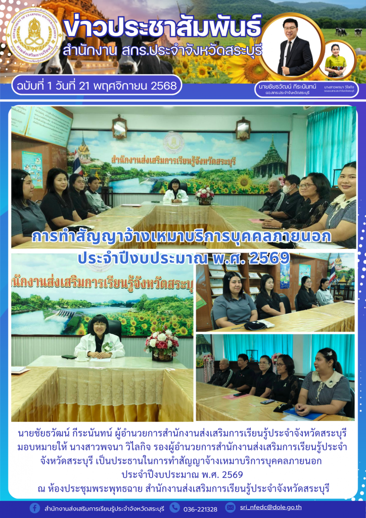 วันที่ 21พฤศจิกายน 2568 นายชัยธวัฒน์ กีระนันทน์ ผู้อำนวยการสำนักงานส่งเสริมการเรียนรู้ประจำจังหวัดสระบุรี มอบหมายให้ นางสาวพจนา วิไลกิจ รองผู้อำนวยการสำนักงานส่งเสริมการเรียนรู้ประจำจังหวัดสระบุรี เป็นประธานในการทำสัญญาจ้างเหมาบริการบุคคลภายนอก ประจำปีงบประมาณ พ.ศ. 2569 ณ ห้องประชุมพระพุทธฉาย สำนักงานส่งเสริมการเรียนรู็ประจำจังหวัดสระบุรี