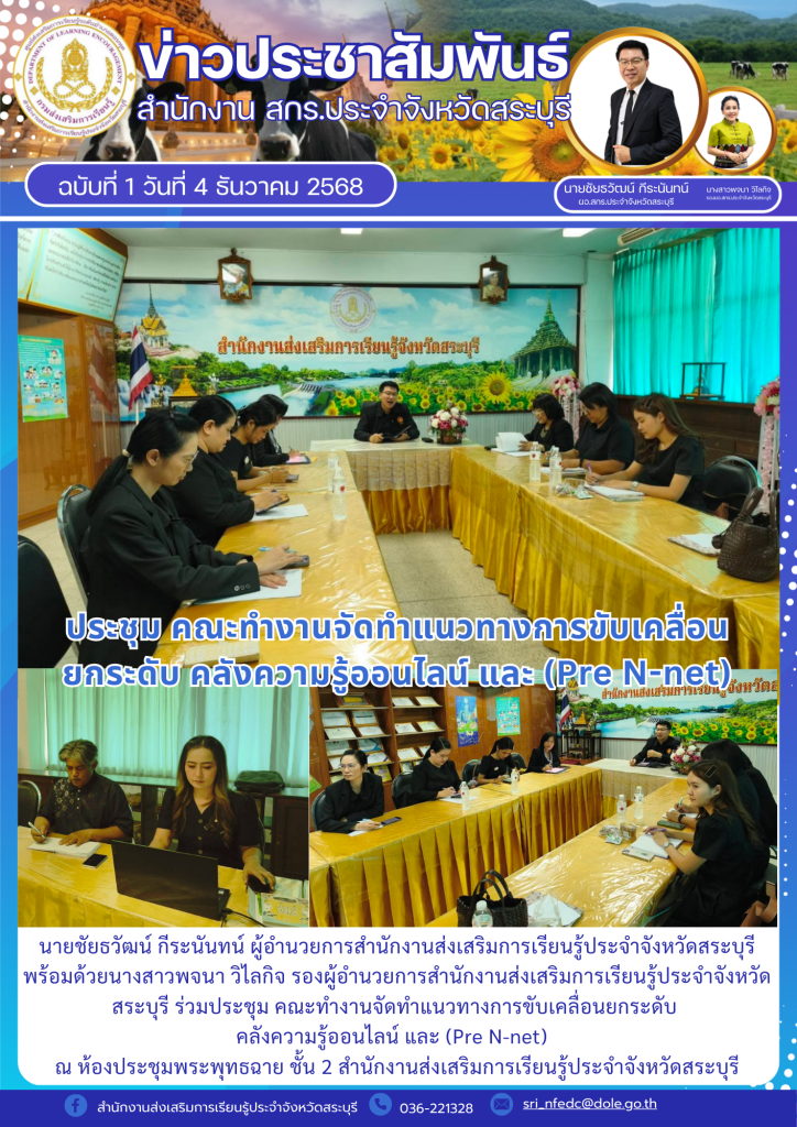 วันที่ 4 ธันวาคม 2568 นายชัยธวัฒน์ กีระนันทน์ ผู้อำนวยการสำนักงานส่งเสริมการเรียนรู้ประจำจังหวัดสระบุรี พร้อมด้วยนางสาวพจนา วิไลกิจ รองผู้อำนวยการสำนักงานส่งเสริมการเรียนรู้ประจำจังหวัดสระบุรี ร่วมประชุม คณะทำงานจัดทำแนวทางการขับเคลื่อนยกระดับ คลังความรู้ออนไลน์ และ (Pre N-net) เพื่อศึกษา วิเคราะห์ และจัดทำแนวทางการพัฒนาและยกระดับผลคะแนนการทดสอบ N-NET ของสถานศึกษาในสังกัดให้มีประสิทธิภาพ และสอดคล้องกับนโยบายของหน่วยงานวางแผน กำกับ ติดตาม และประเมินผลการดำเนินงานตามแนวทางการยกระดับผลคะแนนการทดสอบ N-NET ของสถานศึกษาในสังกัดศึกษา วิเคราะห์ และจัดทำแนวทางการพัฒนาและยกระดับผลคะแนนการทดสอบ N-NET ของสถานศึกษาในสังกัดให้มีประสิทธิภาพ และสอดคล้องกับนโยบายของหน่วยงานวางแผน กำกับ ติดตาม และประเมินผลการดำเนินงานตามแนวทางการยกระดับผลคะแนนการทดสอบ N-NET ของสถานศึกษาในสังกัด ณ ห้องประชุมพระพุทธฉาย ชั้น 2 สำนักงานส่งเสริมการเรียนรู้ประจำจังหวัดสระบุรี