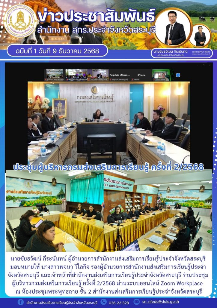 วันที่ 9 ธันวาคม 2568 นายชัยธวัฒน์ กีระนันทน์ ผู้อำนวยการสำนักงานส่งเสริมการเรียนรู้ประจำจังหวัดสระบุรี มอบหมายให้ นางสาวพจนา วิไลกิจ รองผู้อำนวยการสำนักงานส่งเสริมการเรียนรู้ประจำจังหวัดสระบุรี และเจ้าหน้าที่่สำนักงานส่งเสริมการเรียนรู้ประจำจังหวัดสระบุรี ร่วมประชุมผู้บริหารกรมส่งเสริมการเรียนรู้ ครั้งที่ 2/2568 ผ่านระบบออนไลน์ Zoom Workplace เพื่อรับฟังนโยบายสำคัญ แนวทางการดำเนินงาน และภารกิจหลักของกรมส่งเสริม