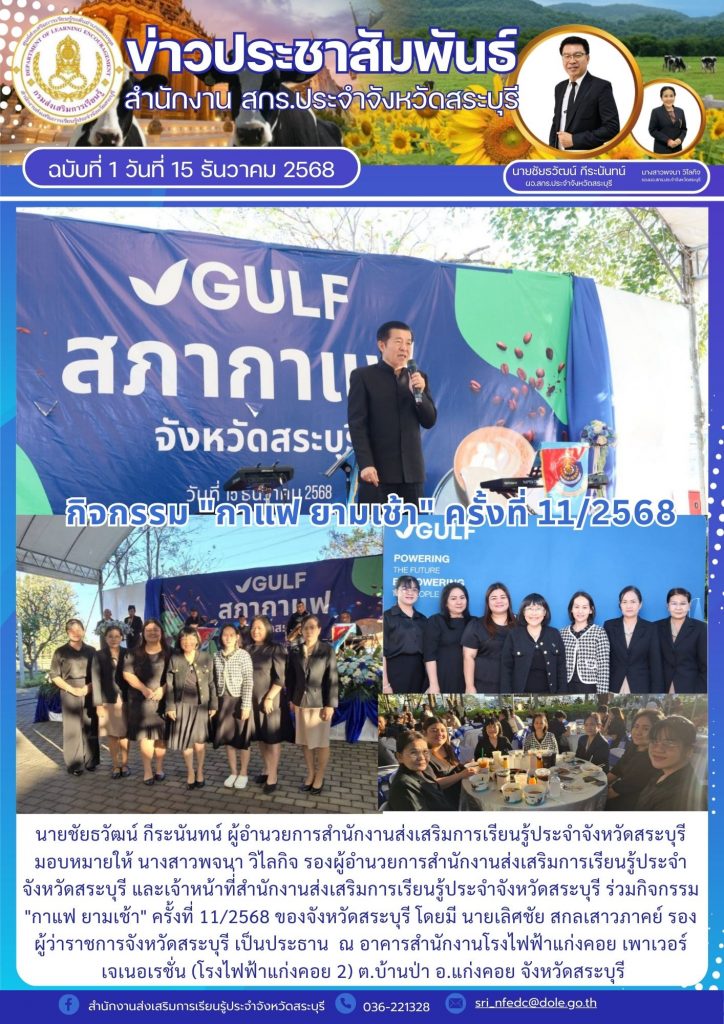 วันที่ 15 ธันวาคม 2568 นายชัยธวัฒน์ กีระนันทน์ ผู้อำนวยการสำนักงานส่งเสริมการเรียนรู้ประจำจังหวัดสระบุรี มอบหมายให้ นางสาวพจนา วิไลกิจ รองผู้อำนวยการสำนักงานส่งเสริมการเรียนรู้ประจำจังหวัดสระบุรี และเจ้าหน้าที่่สำนักงานส่งเสริมการเรียนรู้ประจำจังหวัดสระบุรี ร่วมกิจกรรม “กาแฟ ยามเช้า” ครั้งที่ 11/2568 ของจังหวัดสระบุรี โดยมี นายเลิศชัย สกลเสาวภาคย์ รองผู้ว่าราชการจังหวัดสระบุรี เป็นประธาน ซึ่งการจัดกิจกรรมในครั้งนี้จัดขึ้นเพื่อสร้างความคุ้นเคยและปรึกษาหารือกันของทุกภาคส่วนในจังหวัด แบบไม่เป็นทางการ นำไปสู่การประสานงานและเสริมสร้างความร่วมมือในการทำงานระหว่างกันให้มีประสิทธิภาพยิ่งขึ้น โดยมีผู้เข้าร่วมจากทุกภาคส่วนทั้งหน่วยงานภาครัฐ ภาคเอกชน ภาคประชาสังคม ภาคประชาชน รวมไปถึงสื่อมวลชนทุกแขนง ณ อาคารสำนักงานโรงไฟฟ้าแก่งคอย เพาเวอร์ เจเนอเรชั่น (โรงไฟฟ้าแก่งคอย 2) ต.บ้านป่า อ.แก่งคอย จังหวัดสระบุรี