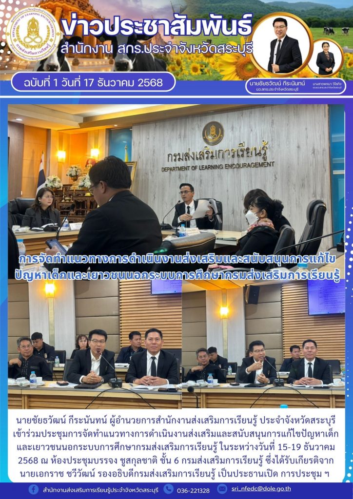 วันที่ 17 ธันวาคม 2568 นายชัยธวัฒน์ กีระนันทน์ ผู้อำนวยการสำนักงานส่งเสริมการเรียนรู้ ประจำจังหวัดสระบุรี เข้าร่วมประชุมการจัดทำแนวทางการดำเนินงานส่งเสริมและสนับสนุนการแก้ไขปัญหาเด็กและเยาวชนนอกระบบการศึกษากรมส่งเสริมการเรียนรู้ ในระหว่างวันที่ 15-19 ธันวาคม 2568 ณ ห้องประชุมบรรจง ชูสกุลชาติ ชั้น 6 กรมส่งเสริมการเรียนรู้ ซึ่งได้รับเกียรติจากนายเอกราช ชวีวัฒน์ รองอธิบดีกรมส่งเสริมการเรียนรู้ เป็นประธานเปิด การประชุม ฯ โดยมีนางเอื้อมพรศรีภูวงศ์ ผู้อำนวยการกองส่งเสริมและพัฒนานวัตกรรมการเรียนรู้เป็นผู้กล่าวรายงานวัตถุประสงค์การประชุม