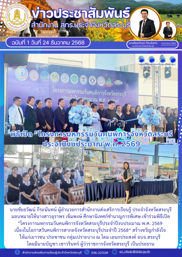 วันพุธที่ 24 ธันวาคม 2568 นายชัยธวัฒน์ กีระนันทน์ ผู้อำนวยการสำนักงานส่งเสริการเรียนรู้ ประจำจังหวัดสระบุรี มอบหมายให้นางสาวอุราพร เข็มพงษ์ ศึกษานิเทศก์ชำนาญการพิเศษ เข้าร่วมพิธีเปิด ”โครงการมหกรรมวันคนพิการจังหวัดสระบุรีประจำปีงบประมาณ พ.ศ. 2569 เนื่องในโอกาสวันคนพิการสากลจังหวัดสระบุรีประจำปี 2568“ สร้างขวัญกำลังใจ ให้แก่เยาวชน ประชาชน กลุ่มเปราะบาง ณ โดม เอนกประสงค์ อบจ.สระบุรี โดยมีนายบัญชา เชาวรินทร์ ผู้ว่าราชการจังหวัดสระบุรี เป็นประธาน เปิดโครงการดังกล่าว