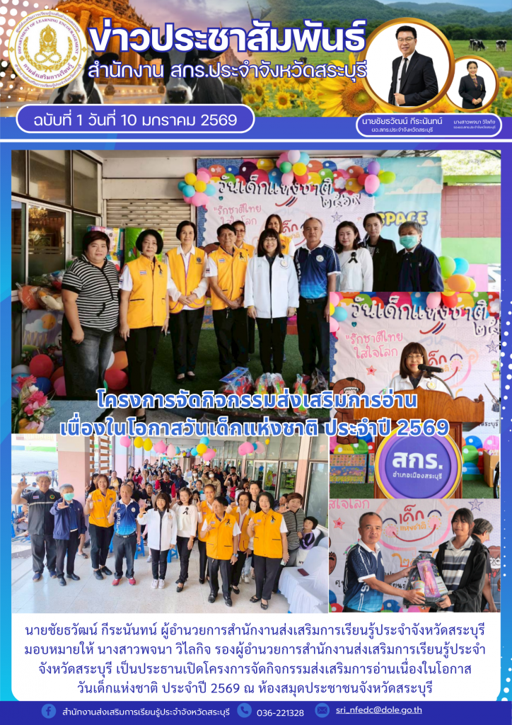 วันที่ 10 มกราคม 2569 นายชัยธวัฒน์ กีระนันทน์ ผู้อำนวยการสำนักงานส่งเสริมการเรียนรู้ประจำจังหวัดสระบุรี มอบหมายให้ นางสาวพจนา วิไลกิจ รองผู้อำนวยการสำนักงานส่งเสริมการเรียนรู้ประจำจังหวัดสระบุรี เป็นประธานเปิดโครงการจัดกิจกรรมส่งเสริมการอ่่านเนื่อในโอกาสวันเด็กแห่งชาติ ประจำปี 2569 ณ ห้องสมุดประชาชนจังหวัดสระบุรี การจัดกิจกรรมส่งเสริมการอ่านและเรียนรู้ที่หลากหลายรูปแบบ เพื่อมอบเป็นของขวัญแก่เด็ก