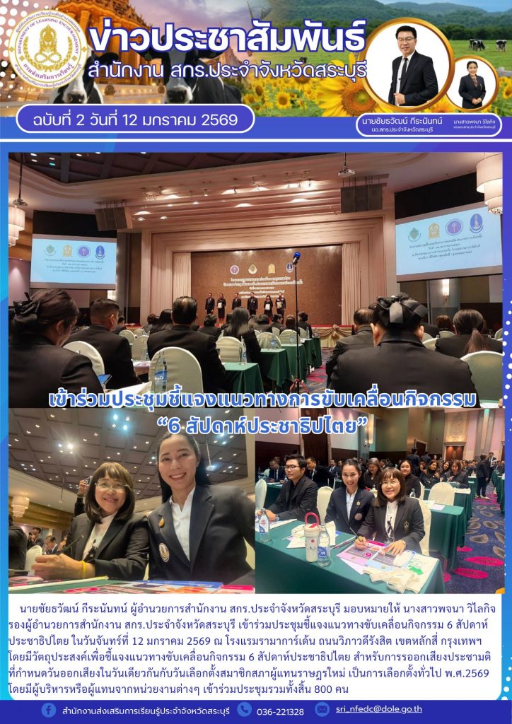 นายชัยธวัฒน์ กีระนันทน์ ผู้อำนวยการสำนักงาน สกร.ประจำจังหวัดสระบุรี มอบหมายให้ นางสาวพจนา วิไลกิจ รองผู้อำนวยการสำนักงาน สกร.ประจำจังหวัดสระบุรี เข้าร่วมประชุมชี้แจงแนวทางขับเคลื่อนกิจกรรม 6 สัปดาห์ประชาธิปไตย ในวันจันทร์ที่ 12 มกราคม 2569 ณ โรงแรมรามาการ์เด้น ถนนวิภาวดีรังสิต เขตหลักสี่ กรุงเทพมหานคร