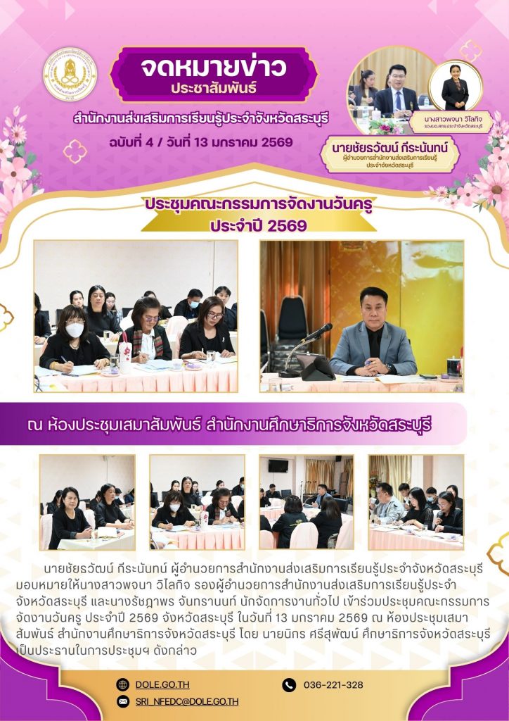 นายชัยธวัฒน์ กีระนันทน์ ผู้อำนวยการสำนักงานส่งเสริมการเรียนรู้ประจำจังหวัดสระบุรี มอบหมายให้ นางสาวพจนา วิไลกิจ รองผู้อำนวยการสำนักงานส่งเสริมการเรียนรู้ประจำจังหวัดสระบุรี และ นางรัชฎาพร จันทรานนท์ นักจัดการงานทั่วไป เข้าร่วมประชุมคณะกรรมการจัดงานวันครู ประจำปี 2569 จังหวัดสระบุรี ในวันที่ 13 มกราคม 2569 ณ ห้องประชุมเสมาสัมพันธ์ สำนักงานศึกษาธิการจังหวัดสระบุรี โดย นายนิกร ศรีสุพัฒน์ ศึกษาธิการจังหวัดสระบุรี เป็นประธานในการประชุมฯ ดังกล่าว