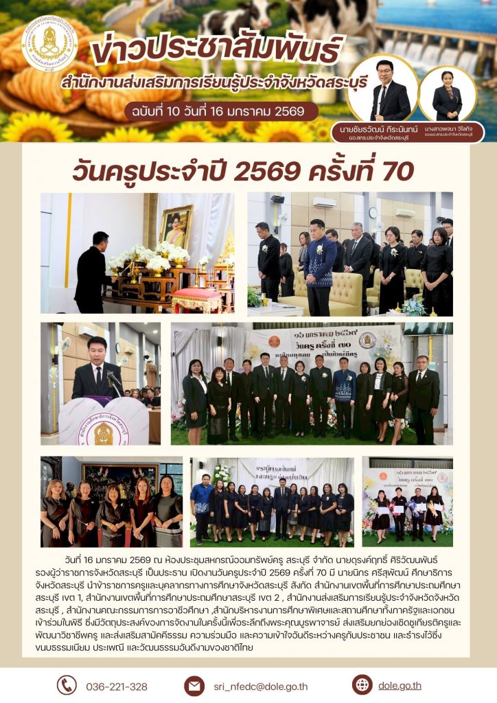 วันที่ 16 มกราคม 2569 ณ ห้องประชุมสหกรณ์ออมทรัพย์ครู สระบุรี จำกัด นายดุรงค์ฤทธิ์ ศิริวัฒนพันธ์ รองผู้ว่าราชการจังหวัดสระบุรี เป็นประธาน เปิดงานวันครูประจำปี 2569 ครั้งที่ 70 มี นายนิกร ศรีสุพัฒน์ ศึกษาธิการจังหวัดสระบุรี นำข้าราชการครูและบุคลากรทางการศึกษาจังหวัดสระบุรี สังกัด สำนักงานเขตพื้นที่การศึกษาประถมศึกษาสระบุรี เขต 1, สำนักงานเขตพื้นที่การศึกษาประถมศึกษาสระบุรี เขต 2 , สำนักงานส่งเสริมการเรียนรู้ประจำจังหวัดจังหวัดสระบุรี , สำนักงานคณะกรรมการการอาชีวศึกษา ,สำนักบริหารงานการศึกษาพิเศษและสถานศึกษาทั้งภาครัฐและเอกชนเข้าร่วมในพิธี ซึ่งมีวัตถุประสงค์ของการจัดงานในครั้งนี้เพื่อระลึกถึงพระคุณบูรพาจารย์ ส่งเสริมยกย่องเชิดชูเกียรติครูและพัฒนาวิชาชีพครู และส่งเสริมสามัคคีธรรม ความร่วมมือ และความเข้าใจอันดีระหว่างครูกับประชาชน และธำรงไว้ซึ่งขนบธรรมเนียม ประเพณี และวัฒนธรรมอันดีงามของชาติไทย