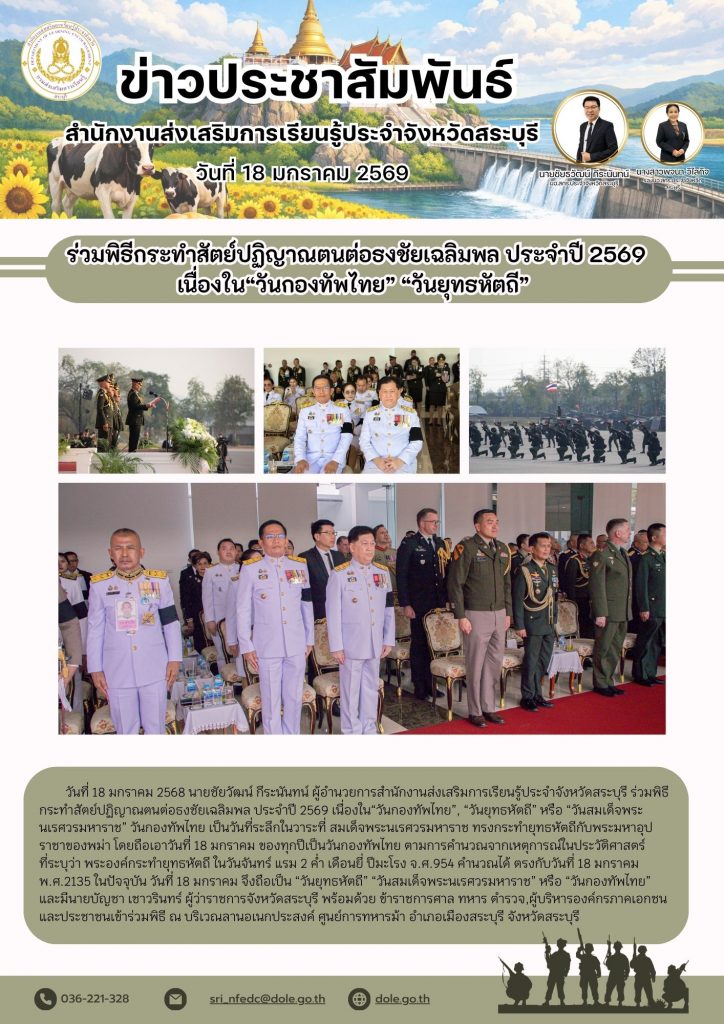 วันที่ 18 มกราคม 2568 นายชัยวัฒน์ กีระนันทน์ ผู้อำนวยการสำนักงานส่งเสริมการเรียนรู้ประจำจังหวัดสระบุรี ร่วมพิธีกระทำสัตย์ปฏิญาณตนต่อธงชัยเฉลิมพล ประจำปี 2569 เนื่องใน“วันกองทัพไทย”, “วันยุทธหัตถี” หรือ “วันสมเด็จพระนเรศวรมหาราช” วันกองทัพไทย เป็นวันที่ระลึกในวาระที่ สมเด็จพระนเรศวรมหาราช ทรงกระทำยุทธหัตถีกับพระมหาอุปราชาของพม่า โดยถือเอาวันที่ 18 มกราคม ของทุกปีเป็นวันกองทัพไทย ตามการคำนวณจากเหตุการณ์ในประวัติศาสตร์ ที่ระบุว่า พระองค์กระทำยุทธหัตถี ในวันจันทร์ แรม 2 ค่ำ เดือนยี่ ปีมะโรง จ.ศ.954 คำนวณได้ ตรงกับวันที่ 18 มกราคม พ.ศ.2135 ในปัจจุบัน วันที่ 18 มกราคม จึงถือเป็น “วันยุทธหัตถี” “วันสมเด็จพระนเรศวรมหาราช” หรือ “วันกองทัพไทย”