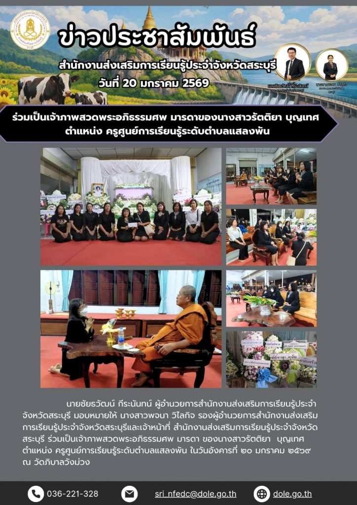 นายชัยธวัฒน์ กีระนันทน์ ผู้อำนวยการสำนักงานส่งเสริมการเรียนรู้ประจำจังหวัดสระบุรี มอบหมายให้ นางสาวพจนา วิไลกิจ รองผู้อำนวยการสำนักงานส่งเสริมการเรียนรู้ประจำจังหวัดสระบุรีและเจ้าหน้าที่ สำนักงานส่งเสริมการเรียนรู้ประจำจังหวัดสระบุรี ร่วมเป็นเจ้าภาพสวดพระอภิธรรมศพ มารดา ของนางสาวรัตติยา บุญเทศ ตำแหน่ง ครูศูนย์การเรียนรู้ระดับตำบลแสลงพัน ในวันอังคารที่ ๒๐ มกราคม ๒๕๖๙ ณ วัดภิบาลวังม่วง