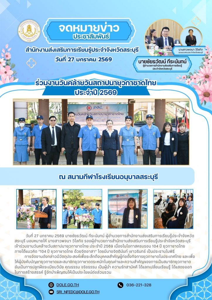 วันที่ 27 มกราคม 2569 นายชัยธวัฒน์ กีระนันทน์ ผู้อำนวยการสำนักงานส่งเสริมการเรียนรู้ประจำจังหวัดสระบุรี มอบหมายให้ นางสาวพจนา วิไลกิจ รองผู้อำนวยการสำนักงานส่งเสริมการเรียนรู้ประจำจังหวัดสระบุรี เข้าร่วมงานวันคล้ายวันสถาปนายุวกาชาดไทย ประจำปี 2569 เนื่องในโอกาสครบรอบ 104 ปี ยุวกาชาดไทย ภายใต้แนวคิด “104 ปี ยุวกาชาดไทย ด้วยจิตอาสา” โดยมีนางจิตตินันท์ เชาวรินทร์ เป็นประธานในพิธี