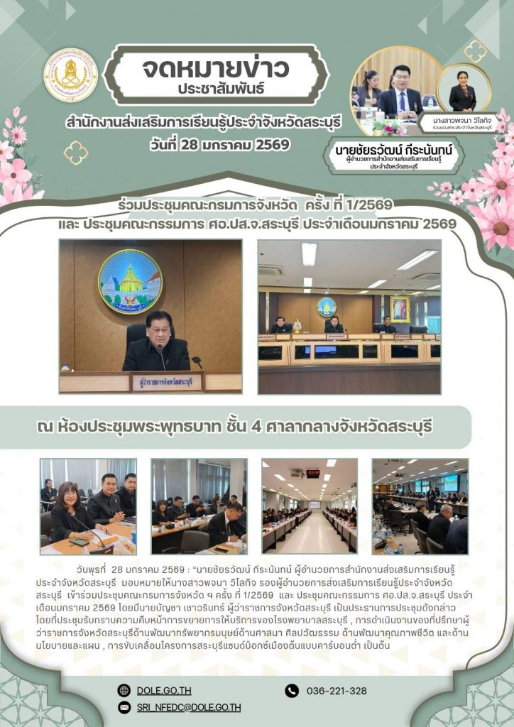 วันพุธที่ 28 มกราคม 2569 นายชัยธวัฒน์ กีระนันทน์ ผู้อำนวยการสำนักงานส่งเสริมการเรียนรู้ประจำจังหวัดสระบุรี มอบหมายให้นางสาวพจนา วิไลกิจ รองผู้อำนวยการส่งเสริมการเรียนรู้ประจำจังหวัดสระบุรี เข้าร่วมประชุมคณะกรมการจังหวัด ฯ ครั้ง ที่ 1/2569 และ ประชุมคณะกรรมการ ศอ.ปส.จ.สระบุรี ประจำเดือนมกราคม 2569 โดยมีนายบัญชา เชาวรินทร์ ผู้ว่าราชการจังหวัดสระบุรี เป็นประธานการประชุมดังกล่าว โดยที่ประชุมรับทราบความคืบหน้าการขยายการให้บริการของโรงพยาบาลสระบุรี , การดำเนินงานของที่ปรึกษาผู้ว่าราชการจังหวัดสระบุรีด้านพัฒนาทรัพยากรมนุษย์ด้านศาสนา ศิลปวัฒธรรม ด้านพัฒนาคุณภาพชีวิต และด้านนโยบายและแผน , การขับเคลื่อนโครงการสระบุรีแซนด์บ็อกซ์เมืองต้นแบบคาร์บอนต่ำ