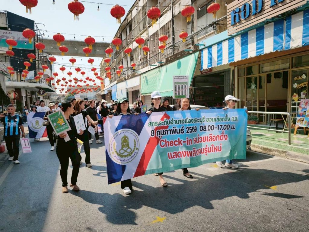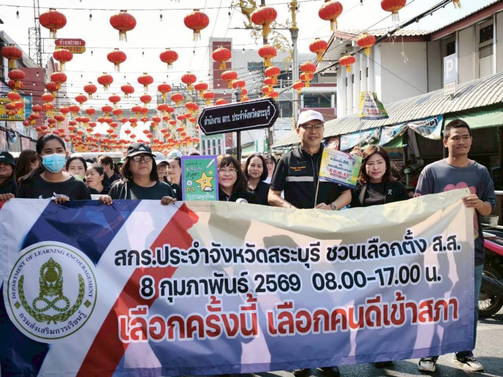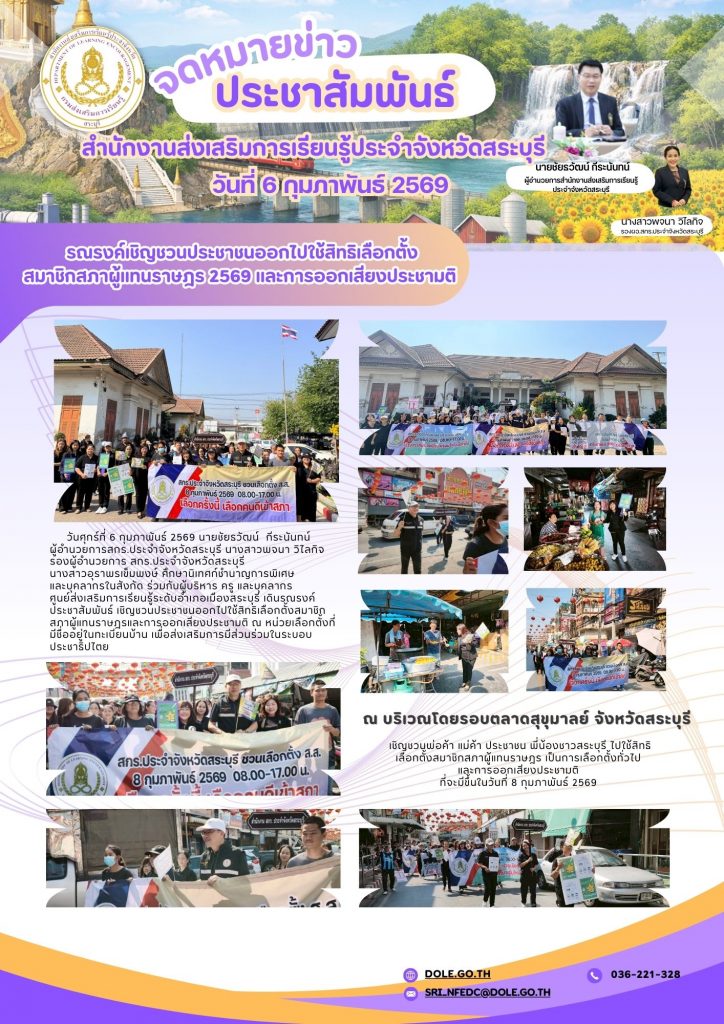 วันศุกร์ที่ 6 กุมภาพันธ์ 2569 นายชัยธวัฒน์ กีระนันทน์ ผู้อำนวยการสำนักงานส่งเสริมการเรียนรู้ประจำจังหวัดสระบุรี นางสาวพจนา วิไลกิจ รองผู้อำนวยการสำนักงานส่งเสริมการเรียนรู้ประจำจังหวัดสระบุรี นางสาวอุราพร เข็มพงษ์ ศึกษานิเทศก์ชำนาญการพิเศษ และบุคลากรในสังกัดสำนักงานส่งเสริมการเรียนรู้ประจำจังหวัดสระบุรี ร่วมกับ นายสมจิตร กองสุข ผู้อำนวยการศูนย์ส่งเสริมการเรียนรู้ระดับอำเภอ เมืองสระบุรี นางพรศรี พุ่มเงิน ครูชำนาญการพิเศษ และนางสาวพิมพ์นิภา ศรีบริบูรณ์สุข ครู สกร.ระดับอำเภอเมืองสระบุรี และบุคลากรในสังกัดศูนย์ส่งเสริมการเรียนรู้ระดับอำเภอเมืองสระบุรี จัดกิจกรรมการรณรงค์สัปดาห์ประชาธิปไตยในสถานศึกษา ให้ความรู้กับนักศึกษาและบุคลากร ณ ห้องประชุม สกร.ระดับอำเภอเมืองสระบุรี ตำบลปากเพรียว อำเภอเมืองสระบุรี จังหวัดสระบุรี พร้อมกับ เดินรณรงค์ประชาสัมพันธ์บริเวณโดยรอบตลาดสุขุมาลย์เชิญชวนพ่อค้า แม่ค้า ประชาชน พี่น้องชาวสระบุรี ไปใช้สิทธิเลือกตั้งสมาชิกสภาผู้แทนราษฎร เป็นการเลือกตั้งทั่วไปและการออกเสียงประชามติที่กำหนด วันออกเสียงประชามติในวันเดียวกันเลือกตั้งสมาชิกสภาผู้แทนราษฎรใหม่ เป็นการเลือกตั้งทั่วไป ณ หน่วยเลือกตั้งที่ท่านมีชื่ออยู่ในทะเบียนบ้าน
