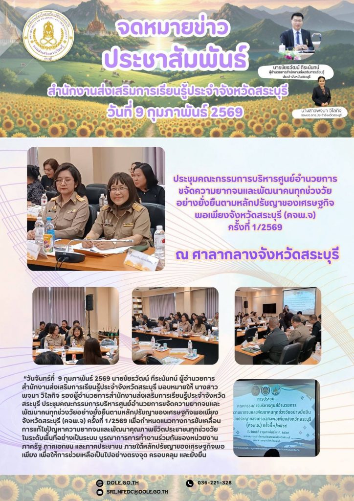 วันจันทร์ที่ 9 กุมภาพันธ์ 2569 นายชัยธวัฒน์ กีระนันทน์ ผู้อำนวยการสำนักงานส่งเสริมการเรียนรู้ประจำจังหวัดสระบุรี มอบหมายให้ นางสาวพจนา วิไลกิจ รองผู้อำนวยการสำนักงานส่งเสริมการเรียนรู้ประจำจังหวัดสระบุรี ประชุมคณะกรรมการบริหารศูนย์อำนวยการขจัดความยากจนและพัฒนาคนทุกช่วงวัยอย่างยั่งยืนตามหลักปรัชญาของเศรษฐกิจพอเพียงจังหวัดสระบุรี (คจพ.จ) ครั้งที่ 1/2569 เพื่อกำหนดแนวทางการขับเคลื่อนการแก้ไขปัญหาความยากจนและพัฒนาคุณภาพชีวิตประชาชนทุกช่วงวัย ในระดับพื้นที่อย่างเป็นระบบ บูรณาการการทำงานร่วมกันของหน่วยงานภาครัฐ ภาคเอกชน และภาคประชาชน ภายใต้หลักปรัชญาของเศรษฐกิจพอเพียง เพื่อให้การช่วยเหลือเป็นไปอย่างตรงจุด ครอบคลุม และยั่งยืน