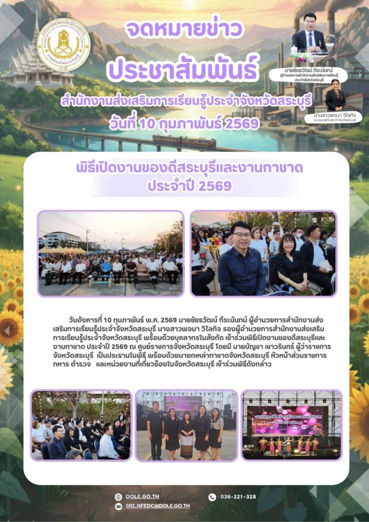 วันอังคารที่ 10 กุมภาพันธ์ พ.ศ. 2569 นายชัยธวัฒน์ กีระนันทน์ ผู้อำนวยการสำนักงานส่งเสริมการเรียนรู้ประจำจังหวัดสระบุรี นางสาวพจนา วิไลกิจ รองผู้อำนวยการสำนักงานส่งเสริมการเรียนรู้ประจำจังหวัดสระบุรี พร้อมด้วยบุคลากรในสังกัด เข้าร่วมพิธีเปิดงานของดีสระบุรีและงานกาชาด ประจำปี 2569 ณ ศูนย์ราชการจังหวัดสระบุรี โดยมี นายบัญชา เชาวรินทร์ ผู้ว่าราชการจังหวัดสระบุรี เป็นประธานในพิธี พร้อมด้วยนายกเหล่ากาชาดจังหวัดสระบุรี หัวหน้าส่วนราชการ ทหาร ตำรวจ และหน่วยงานที่เกี่ยวข้องในจังหวัดสระบุรี เข้าร่วมพิธีดังกล่าว