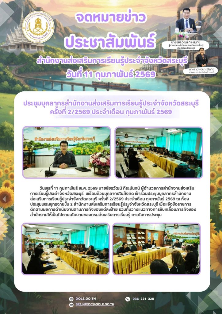 วันพุธที่ 11 กุมภาพันธ์ พ.ศ. 2569 นายชัยธวัฒน์ กีระนันทน์ ผู้อำนวยการสำนักงานส่งเสริมการเรียนรู้ประจำจังหวัดสระบุรี พร้อมด้วยบุคลากรในสังกัด เข้าร่วมประชุมบุคลากรสำนักงาน ส่งเสริมการเรียนรู้ประจำจังหวัดสระบุรี ครั้งที่ 2/2569 ประจำเดือน กุมภาพันธ์ 2569 ณ ห้องประชุมพระพุทธฉายชั้น 2 สำนักงานส่งเสริมการเรียนรู้ประจำจังหวัดสระบุรี พื่อแจ้งข้อราชการ ติดตามผลการดำเนินงานตามภารกิจของแต่ละฝ่าย รวมทั้งวางแนวทางการขับเคลื่อนภารกิจของสำนักงานให้เป็นไปตามนโยบายของกรมส่งเสริมการเรียนรู้ ภายในการประชุม