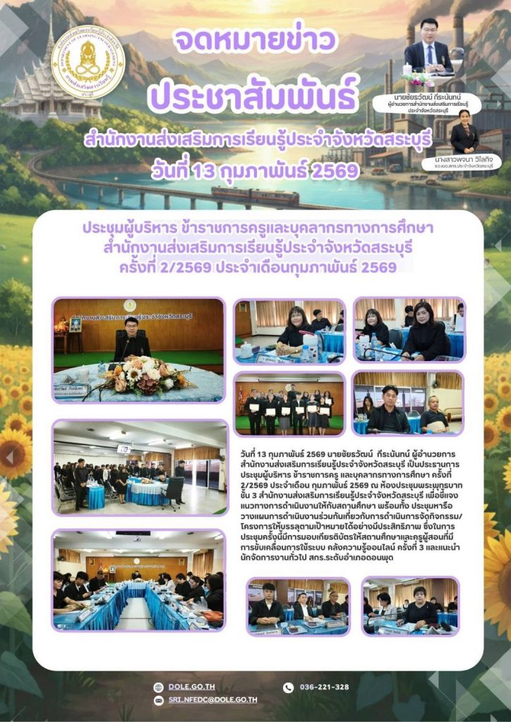 วันที่ 13 กุมภาพันธ์ 2569 นายชัยธวัฒน์ กีระนันทน์ ผู้อำนวยการสำนักงานส่งเสริมการเรียนรู้ประจำจังหวัดสระบุรี เป็นประธานการประชุมผู้บริหาร ข้าราชการครู เเละบุคลากรทางการศึกษา ครั้งที่ 2/2569 ประจำเดือน กุมภาพันธ์ 2569 ณ ห้องประชุมพระพุทธบาท ชั้น 3 สำนักงานส่งเสริมการเรียนรู้ประจำจังหวัดสระบุรี เพื่อชี้แจงแนวทางการดำเนินงานให้กับสถานศึกษา พร้อมทั้ง ประชุมหารือ วางแผนการดำเนินงานร่วมกันเกี่ยวกับการดำเนินการจัดกิจกรรม/โครงการให้บรรลุตามเป้าหมายได้อย่างมีประสิทธิภาพ ซึ่งในการประชุมครั้งนี้มีการมอบเกียรติบัตรให้สถานศึกษาและครูผู้สอนที่มีการขับเคลื่อนการใช้ระบบ คลังความรู้ออนไลน์ ครั้งที่ 3 และแนะนำนักจัดการงานทั่วไป สกร.ระดับอำเภอดอนพุด