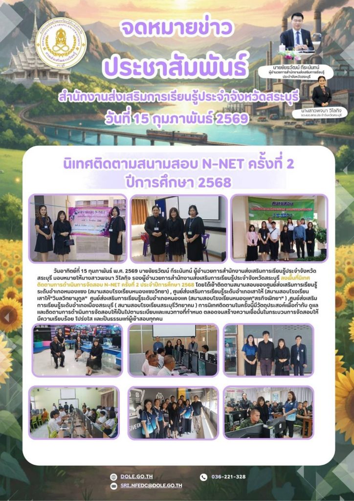วันอาทิตย์ที่ 15 กุมภาพันธ์ พ.ศ. 2569 นายชัยธวัฒน์ กีระนันทน์ ผู้อำนวยการสำนักงานส่งเสริมการเรียนรู้ประจำจังหวัดสระบุรี มอบหมายให้นางสาวพจนา วิไลกิจ รองผู้อำนวยการสำนักงานส่งเสริมการเรียนรู้ประจำจังหวัดสระบุรี ลงพื้นที่นิเทศ ติดตามการดำเนินการจัดสอบ N-Net ครั้งที่ 2 ประจำปีการศึกษา 2568 โดยได้เข้าติดตามสนามสอบของศูนย์ส่งเสริมการเรียนรู้ระดับอำเภอหนองแซง (สนามสอบโรงเรียนหนองแซงวิทยา) , ศูนย์ส่งเสริมการเรียนรู้ระดับอำเภอเสาไห้ (สนามสอบโรงเรียนเสาไห้”วิมลวิทยานุกูล” ศูนย์ส่งเสริมการเรียนรู้ระดับอำเภอหนองแค (สนามสอบโรงเรียนหนองแค”สรกิจพิทยา” ) ,ศูนย์ส่งเสริมการเรียนรู้ระดับอำเภอเมืองสระบุรี ( สนามสอบโรงเรียนสระบุรีวิทยาคม ) การนิเทศติดตามในครั้งนี้มีวัตถุประสงค์เพื่อกำกับ ดูแล และติดตามการดำเนินการจัดสอบให้เป็นไปตามระเบียบและแนวทางที่กำหนด ตลอดจนสร้างความเชื่อมั่นในกระบวนการจัดสอบให้มีความเรียบร้อย โปร่งใส และเป็นธรรมแก่ผู้เข้าสอบทุกคน