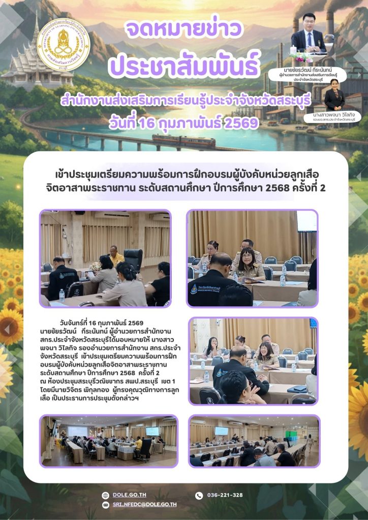วันจันทร์ที่ 16 กุมภาพันธ์ 2569 นายชัยธวัฒน์ กีระนันทน์ ผู้อำนวยการสำนักงาน สกร.ประจำจังหวัดสระบุรีได้มอบหมายให้ นางสาวพจนา วิไลกิจ รองอำนวยการสำนักงาน สกร.ประจำจังหวัดสระบุรี เข้าประชุมเตรียมความพร้อมการฝึกอบรมผู้บังคับหน่วยลูกเสือจิตอาสาพระราชทานระดับสถานศึกษา ปีการศึกษา 2568 ครั้งที่ 2 ณ ห้องประชุมสระบุรีวณิชชากร สพป.สระบุรี เขต 1 โดยมีนายวิจิตร พิกุลทอง ผู้ทรงคุณวุฒิทางการลูกเสือ เป็นประธานการประชุมดังกล่าวฯ