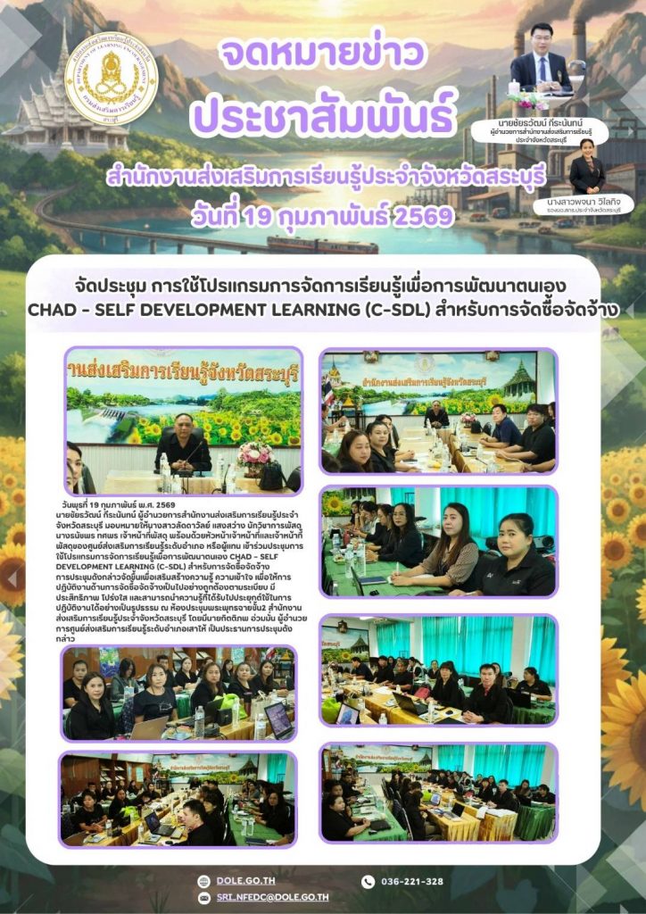 นายชัยธวัฒน์ กีระนันทน์ ผู้อำนวยการสำนักงานส่งเสริมการเรียนรู้ประจำจังหวัดสระบุรี มอบหมายให้นางสาวลัดดาวัลย์ แสงสว่าง นักวิชาการพัสดุ นางธนัชพร ทศพร เจ้าหน้าที่พัสดุ พร้อมด้วยหัวหน้าเจ้าหน้าที่และเจ้าหน้าที่พัสดุของศูนย์ส่งเสริมการเรียนรู้ระดับอำเภอ หรือผู้แทน เข้าร่วมประชุมการใช้โปรแกรมการจัดการเรียนรู้เพื่อการพัฒนาตนเอง Chad – Self Development Learning (C-SDL) สำหรับการจัดซื้อจัดจ้าง