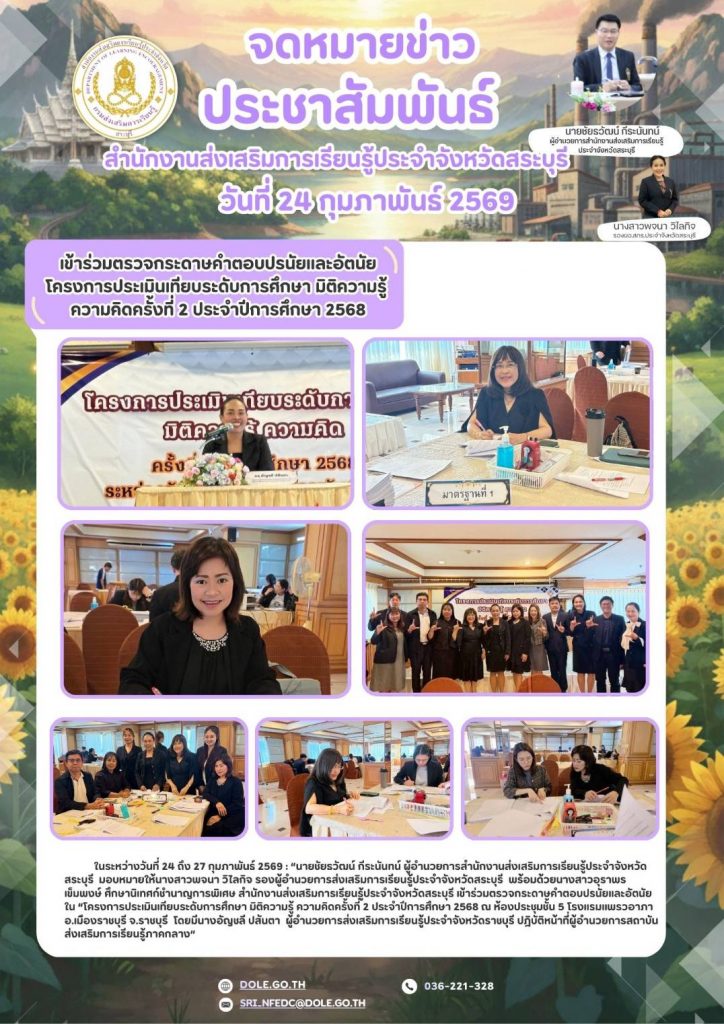 ในระหว่างวันที่ 24 ถึง 27 กุมภาพันธ์ 2569 : “นายชัยธวัฒน์ กีระนันทน์ ผู้อำนวยการสำนักงานส่งเสริมการเรียนรู้ประจำจังหวัดสระบุรี มอบหมายให้นางสาวพจนา วิไลกิจ รองผู้อำนวยการส่งเสริมการเรียนรู้ประจำจังหวัดสระบุรี พร้อมด้วยนางสาวอุราพร เข็มพงษ์ ศึกษานิเทศก์ชำนาญการพิเศษ สำนักงานส่งเสริมการเรียนรู้ประจำจังหวัดสระบุรี เข้าร่วมตรวจกระดาษคำตอบปรนัยและอัตนัยใน “โครงการประเมินเทียบระดับการศึกษา มิติความรู้ ความคิดครั้งที่ 2 ประจำปีการศึกษา 2568 ณ ห้องประชุมชั้น 5 โรงแรมแพรวอาภา อ.เมืองราชบุรี จ.ราชบุรี โดยมีนางอัญชลี ปสันตา ผู้อำนวยการส่งเสริมการเรียนรู้ประจำจังหวัดราชบุรี ปฎิบัติหน้าที่ผู้อำนวยการสถาบันส่งเสริมการเรียนรู้ภาคกลาง“