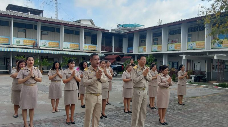 นำคณะบุคลากรเข้าแถวเคารพธงชาติ และสวดมนต์