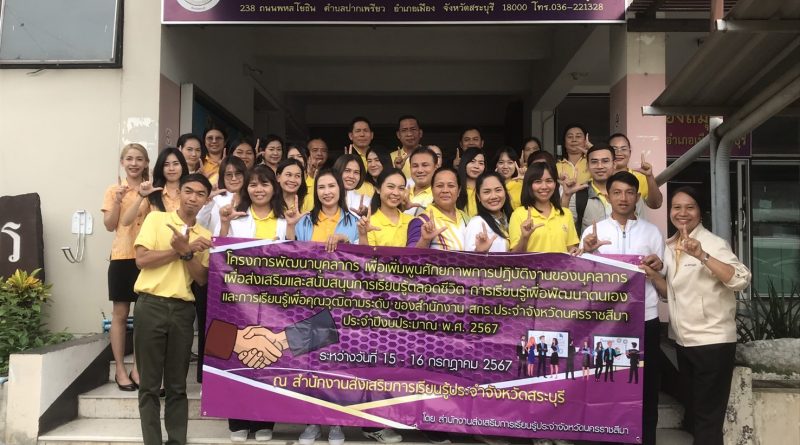 15 กรกฎาคม 2567 นายชัยธวัฒน์ กีระนันทน์ ผู้อำนวยการ สำนักงานส่งเสริมการเรียนรู้ประจำจังหวัดสระบุรี มอบหมายให้ นายคณิน ทองเอียด ตำแหน่ง รองผู้อำนวยการสำนักงาน กศน.จังหวัดสระบุรี ปฏิบัติหน้าที่ผู้อำนวยการสำนักงานส่งเสริมการเรียนรู้ประจำจังหวัดสระบุรี ต้อนรับคณะบุคลากรสำนักงาน สกร.ประจำจังหวัดนครราชสีมา ในการมาศึกษาดูงานตามโครงการพัฒนาบุคลากรเพื่อเพิ่มพูนศักยภาพการปฏิบัติของบุคลากรเพื่อส่งเสริมและสนับสนุนการเรียนรู้ตลอดชีวิต การเรียนรู้เพื่อพัฒนาตนเอง และการเรียนรู้เพื่อคุณวุฒิตามระดับ ของสำนักงาน สกร.ประจำจังหวัดนครราชสีมา ประจำปีงบประมาณ พ.ศ. 2567 ขึ้นเพื่อพัฒนาบุคลากรทุกระดับ ให้มีความรู้และทักษะที่จำเป็นในการปฏิบัติงานด้านการส่งเสริมและสนับสนุนการเรียนรู้ตลอดชีวิต การเรียนรู้เพื่อพัฒนาตนเอง และการเรียนรู้เพื่อคุณวุฒิตามระดับให้กับนักศึกษา สกร. ในวันที่ 15 กรกฎาคม 2567 ณ สำนักงานส่งเสริมการเรียนรู้ประจำจังหวัดสระบุรี และศูนย์ส่งเสริมการเรียนรู้ระดับอำเภอเมืองสระบุรี