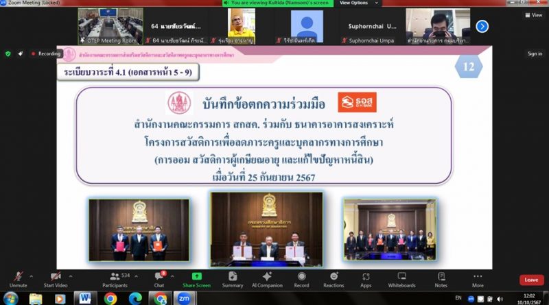 วันที่ ๑๐ ตุลาคม ๒๕๖๗ นายชัยธวัฒน์ กีระนันทน์ ผู้อำนวยการ สำนักงานส่งเสริมการเรียนรู้ประจำจังหวัดสระบุรี มอบหมายให้ นางรัชฎาพร จันทรานนท์ ตำแหน่ง นักจัดการงานทั่วไป เข้าร่วมประชุมผู้บริหารสำนักงานคณะกรรมการ สกสค. ร่วมกับ คณะกรรมการ สกสค.จังหวัด และคณะกรรมการ สกสค.กรุงเทพมหานคร ครั้งที่ 1/2567 โดยประชุมผ่านสื่ออิเล็กทรอนิกส์โปรแกรม Zoom Cloud Meetimgs